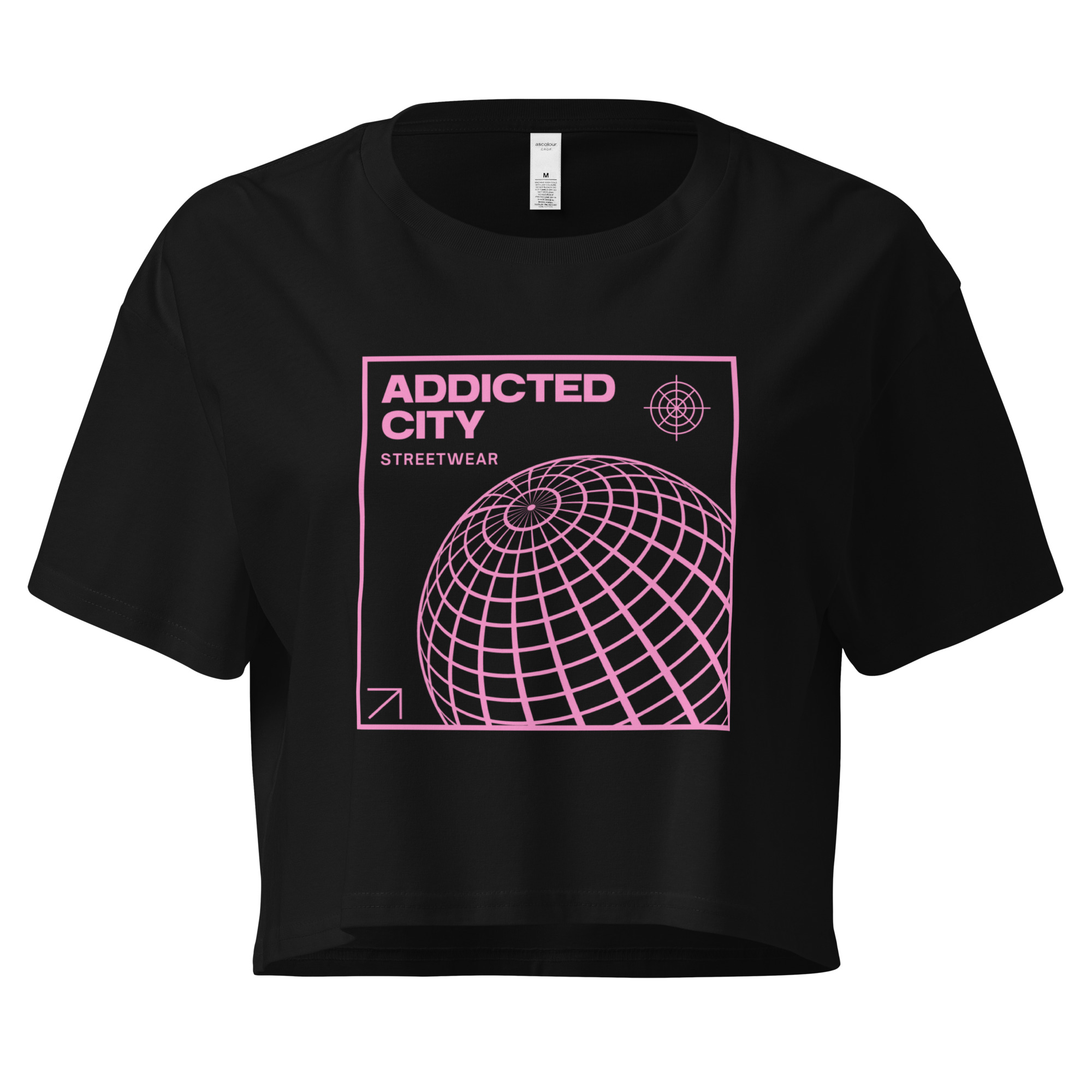 Keywords: Addicted City crop top, pink graphic crop top, urban streetwear, trendy crop top, bold graphic tee, women’s graphic top, casual crop top, graphic tee, stylish crop top, street style fashion, pink crop top, modern streetwear, vibrant crop top, city logo crop top.