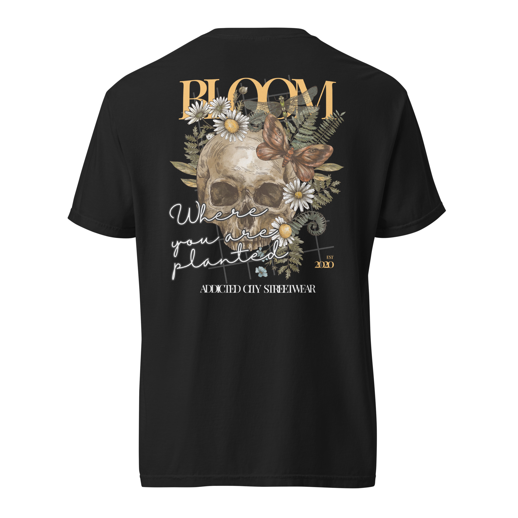 Keywords: candy skull t-shirt, bloom t-shirt, floral skull design, vibrant skull shirt, colorful graphic tee, empowering message t-shirt, skull and flowers tee, artistic candy skull shirt, nature-inspired graphic tee, unisex skull shirt, inspirational “bloom” shirt, edgy floral shirt, skull and flowers t-shirt, colorful floral tee, transformation shirt.