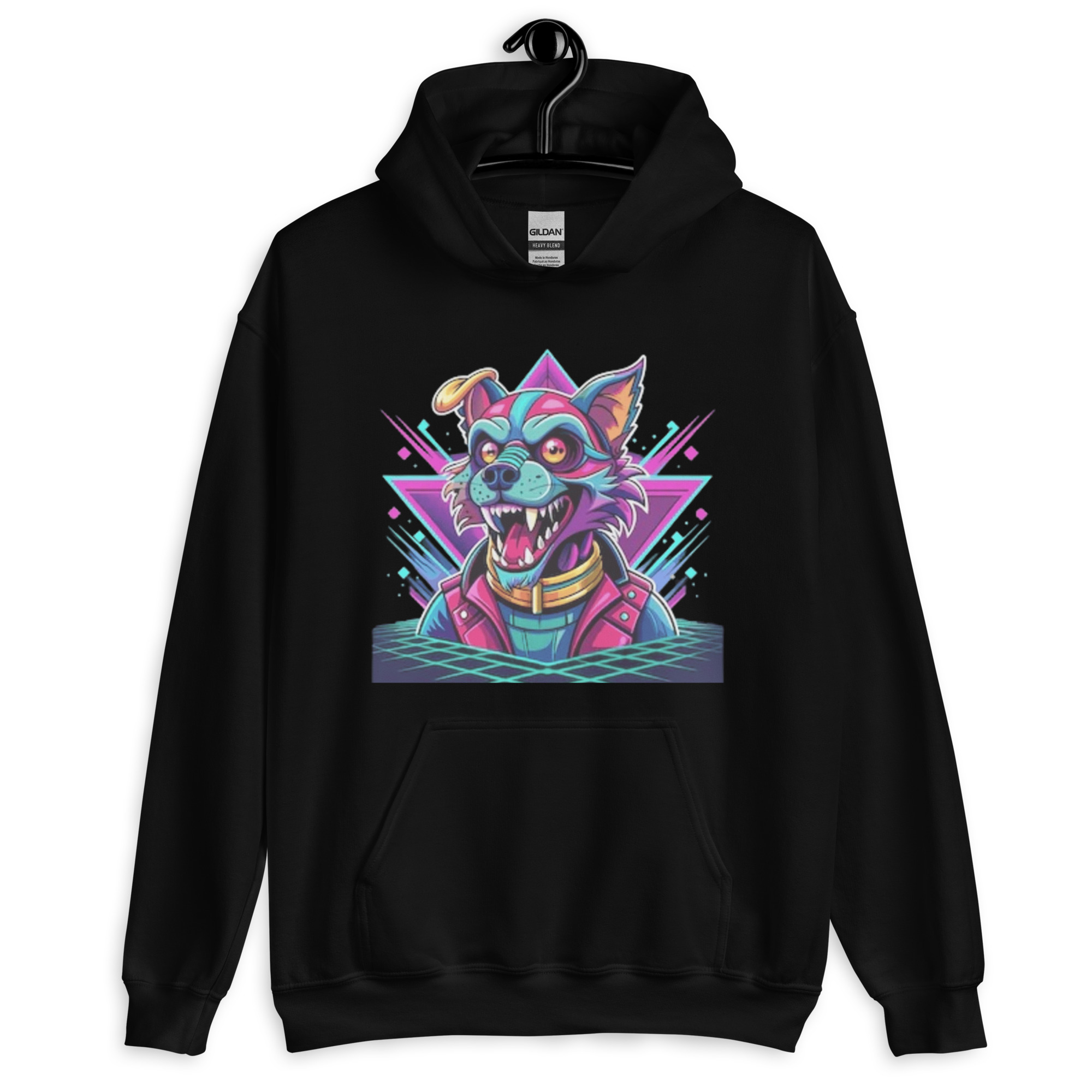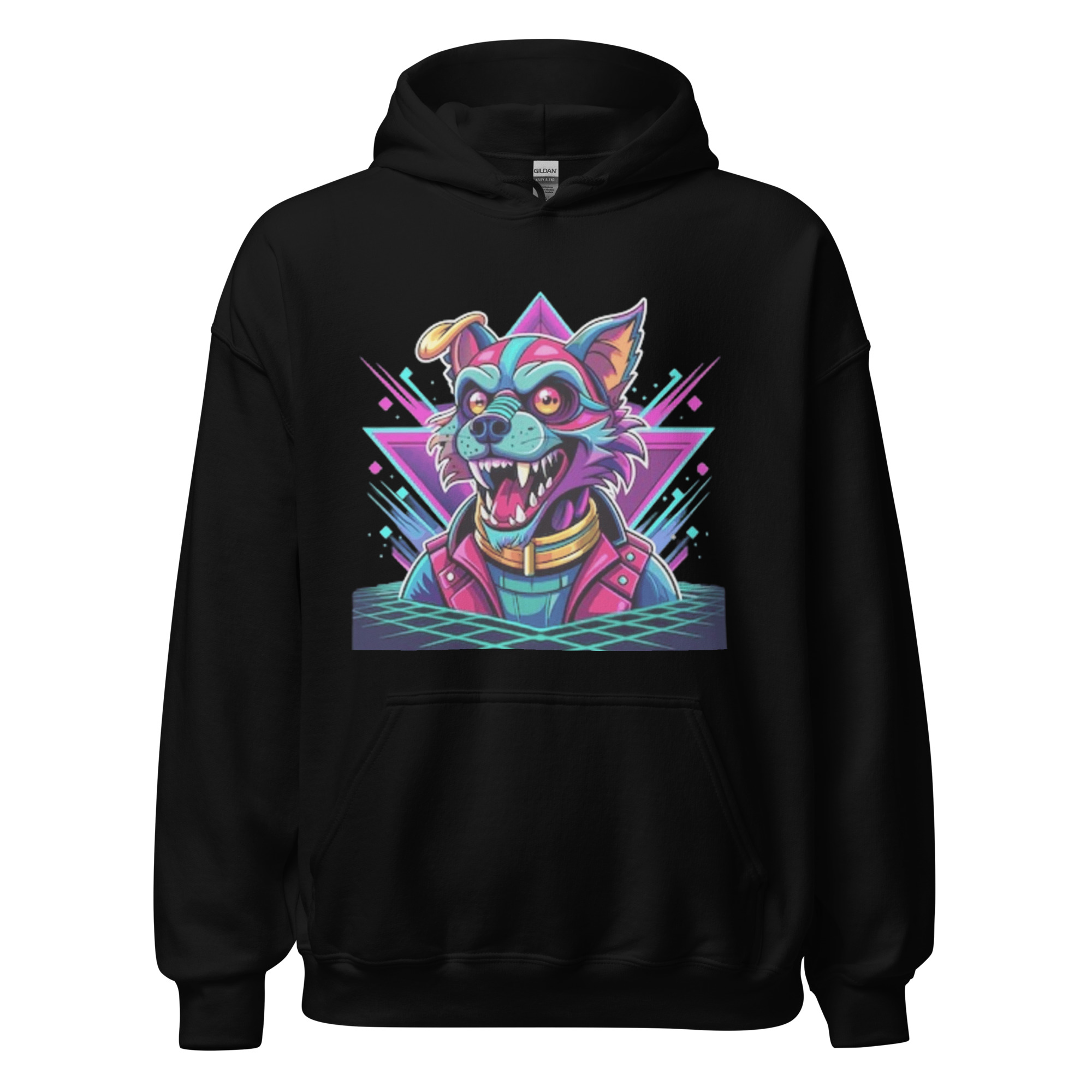 Stand out with the Addicted City Black Hoodie, featuring a bold and colorful design of a sadistic smiling dog in a bomber jacket, set against a backdrop of abstract, exploding triangles. This edgy graphic hoodie combines playful rebellion with artistic flair, making it a statement piece for anyone who dares to be different. Crafted from soft, high-quality fabric, it provides both comfort and style, perfect for those looking to add a unique touch to their wardrobe.