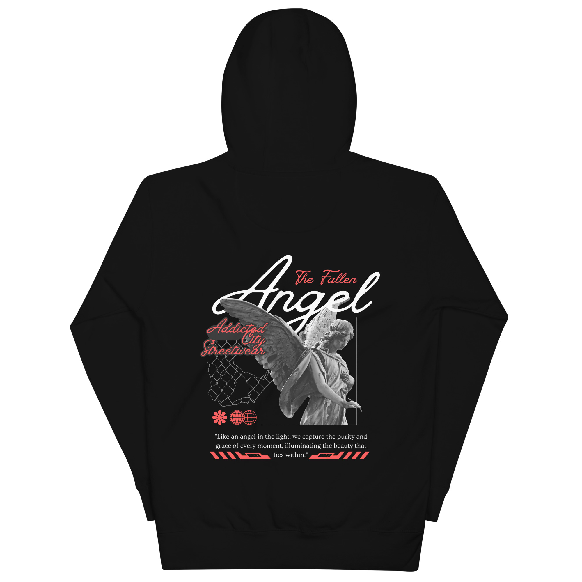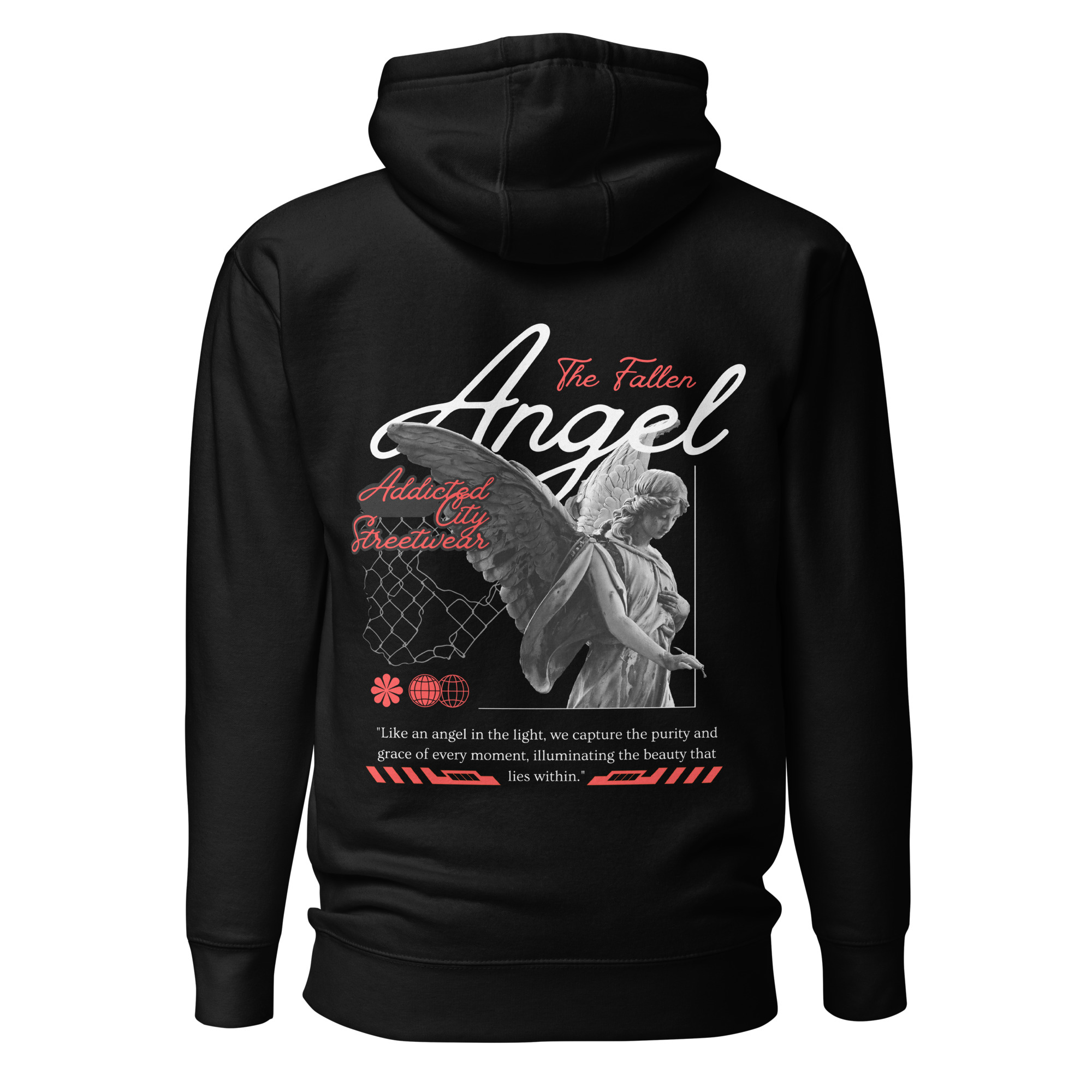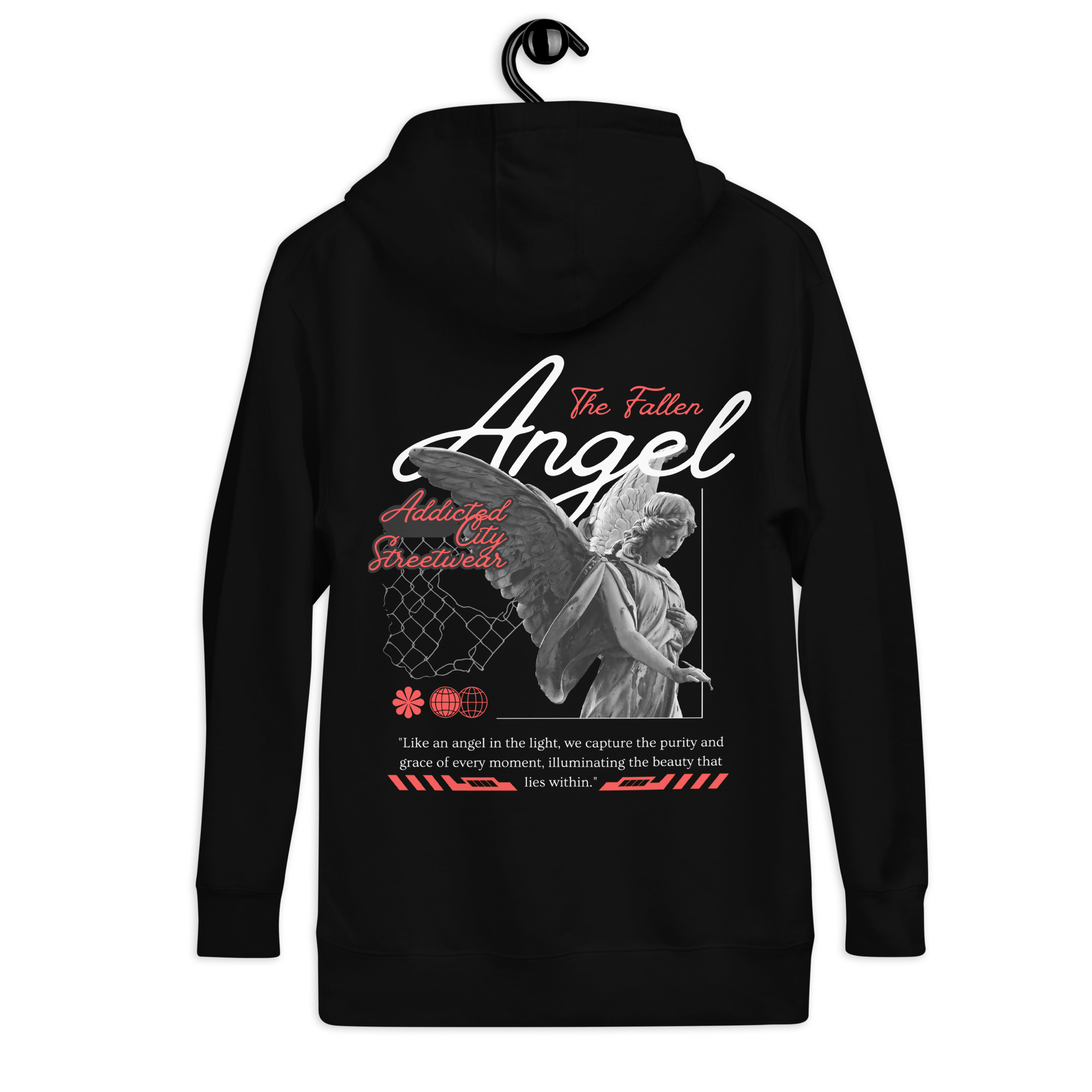 Keywords: Fallen Angel hoodie, Addicted City Streetwear, black hoodie, urban streetwear, graphic hoodie, men’s hoodie, women’s hoodie, streetwear fashion, street style hoodie, cool hoodie, edgy hoodie.