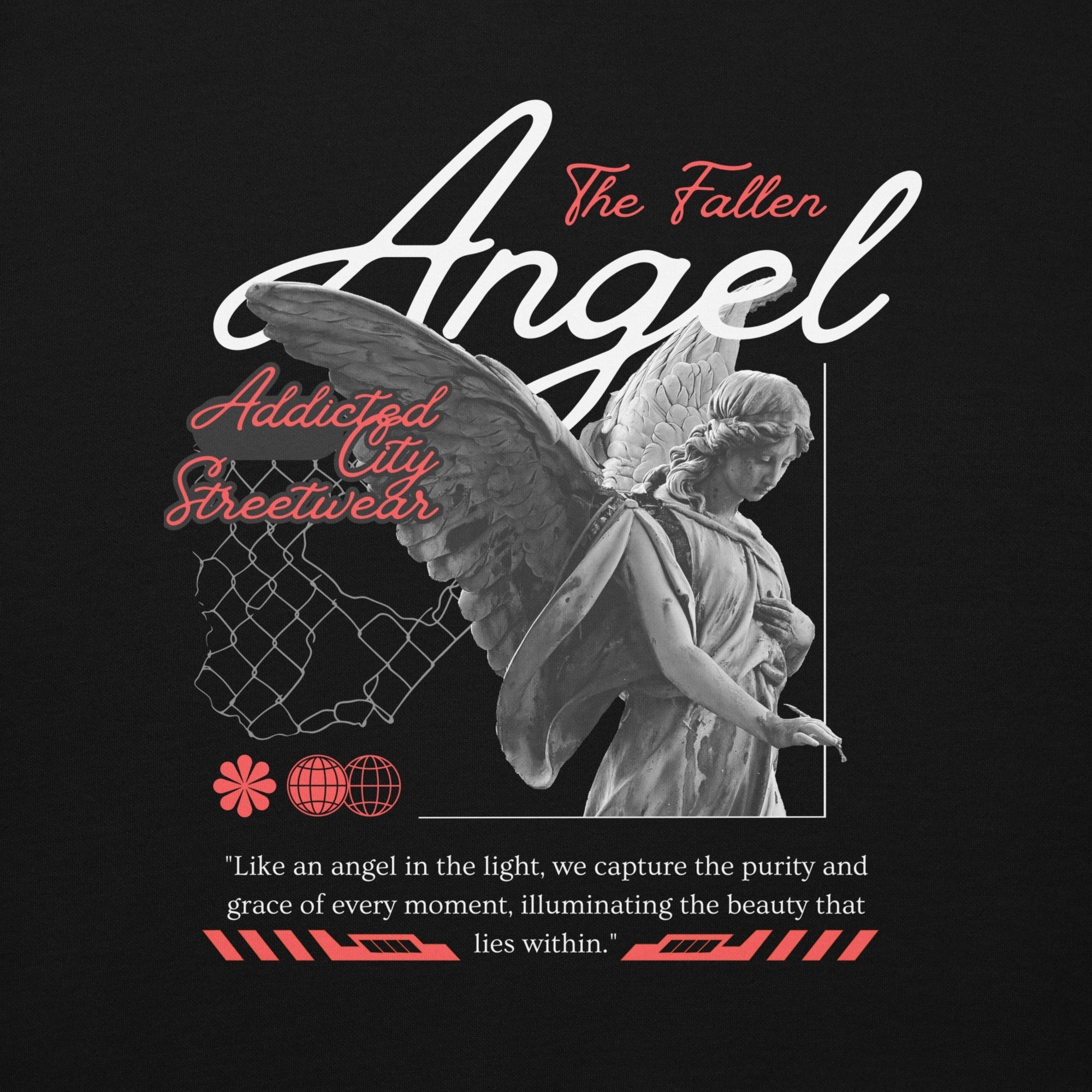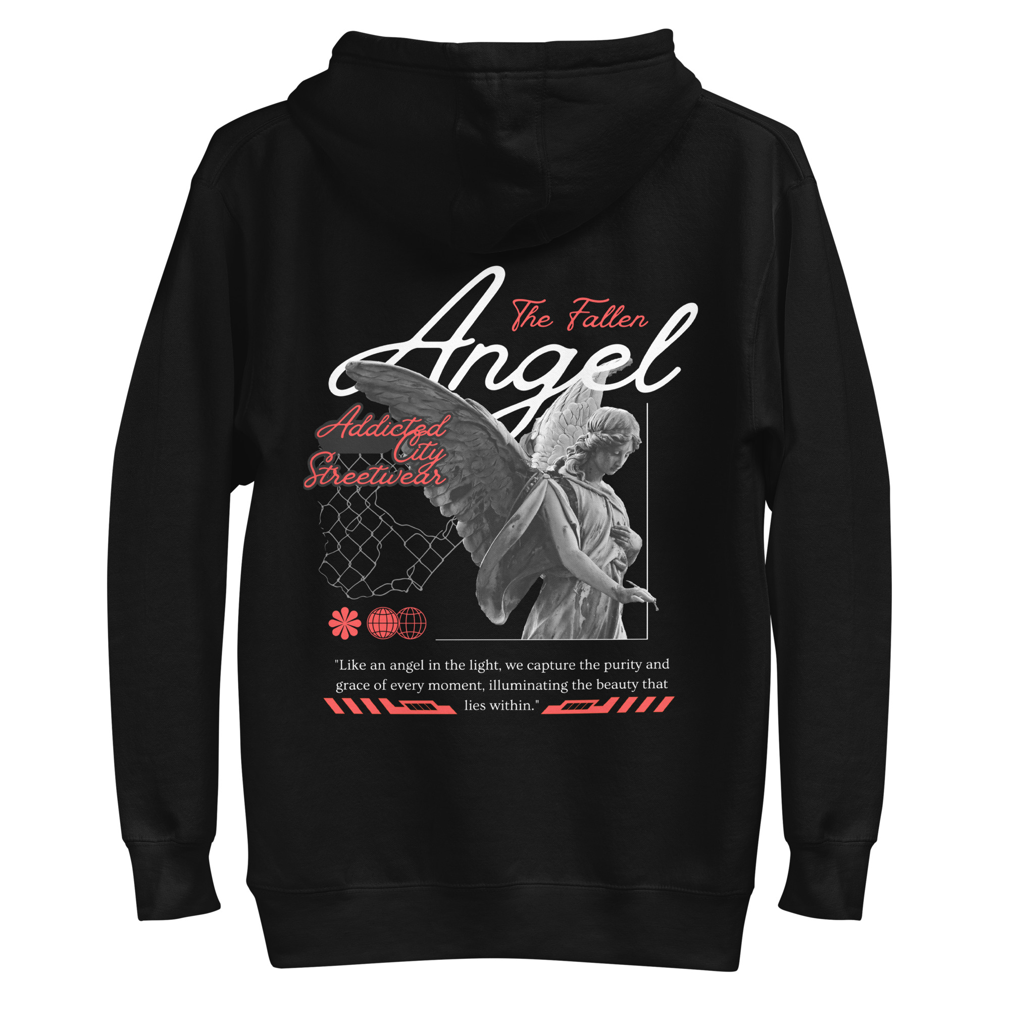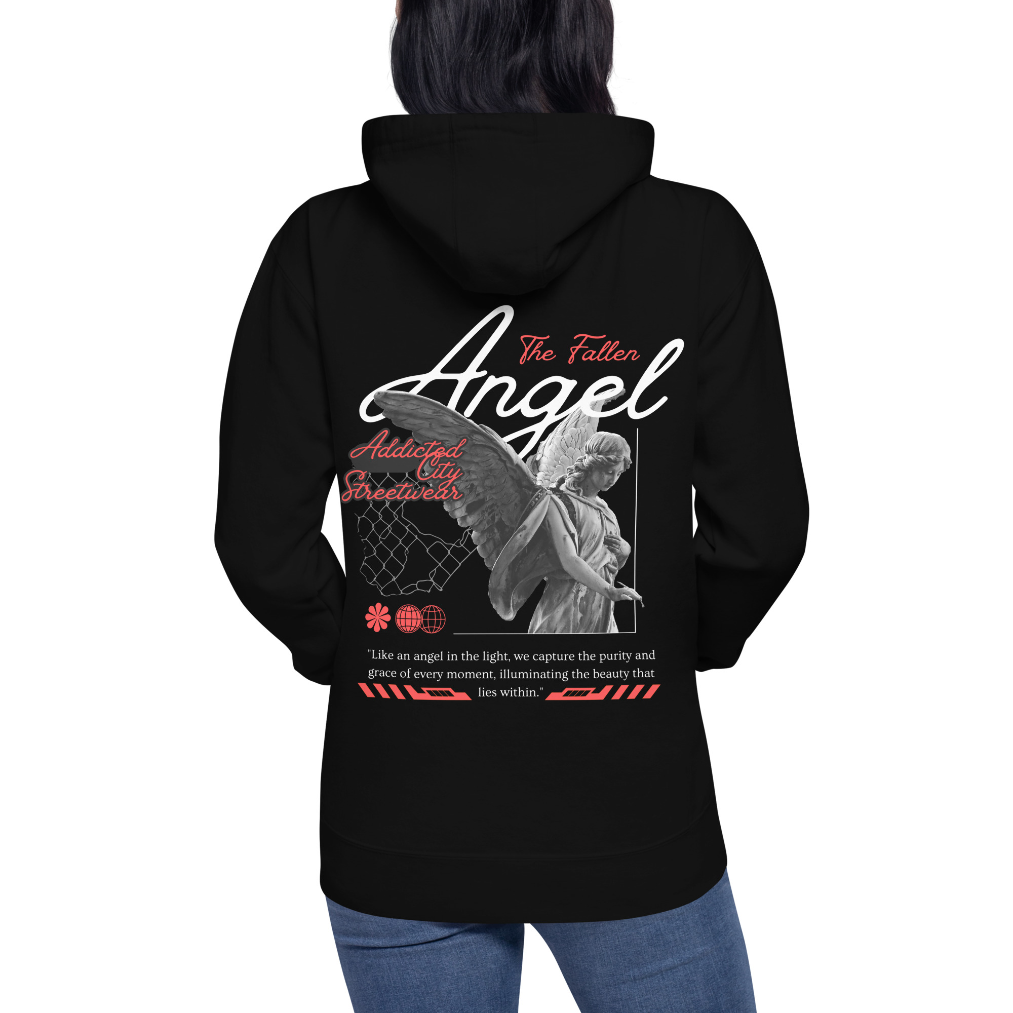 Keywords: Fallen Angel hoodie, Addicted City Streetwear, black hoodie, urban streetwear, graphic hoodie, men’s hoodie, women’s hoodie, streetwear fashion, street style hoodie, cool hoodie, edgy hoodie.