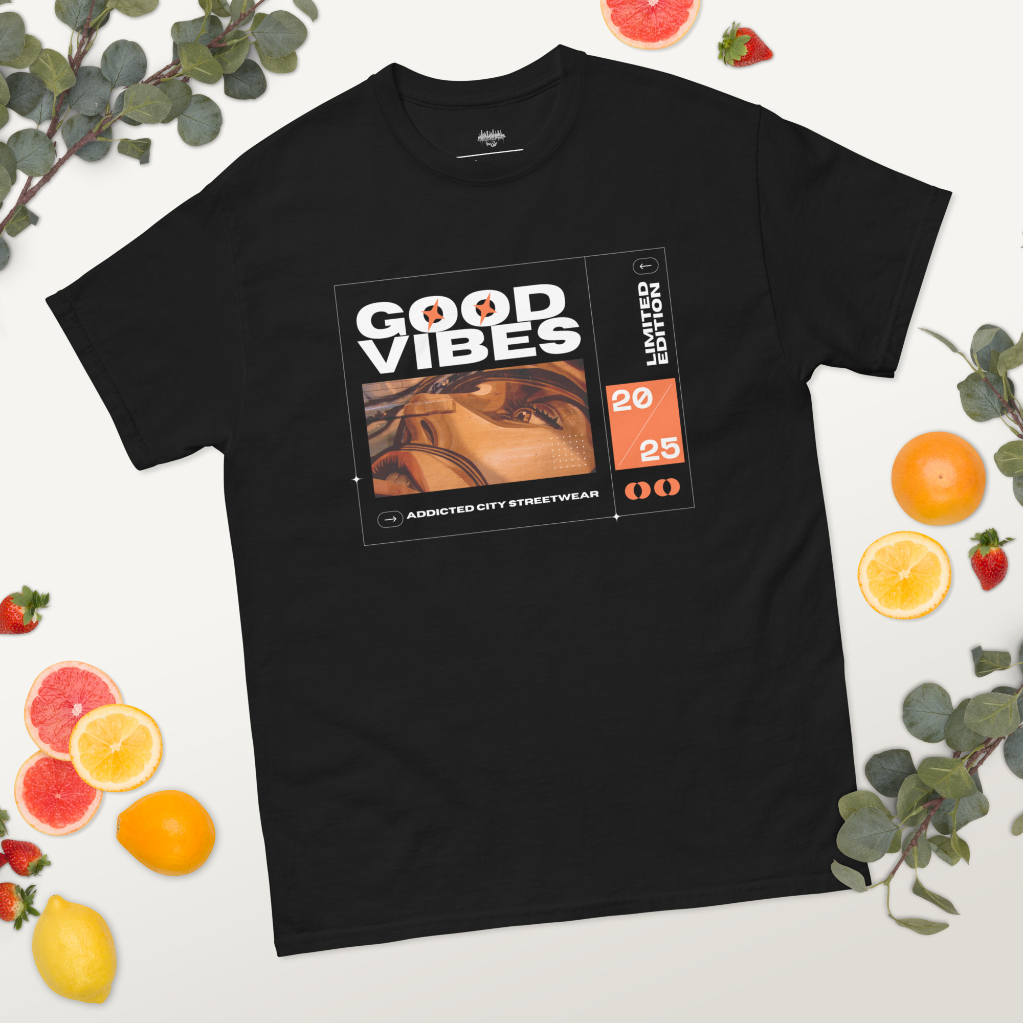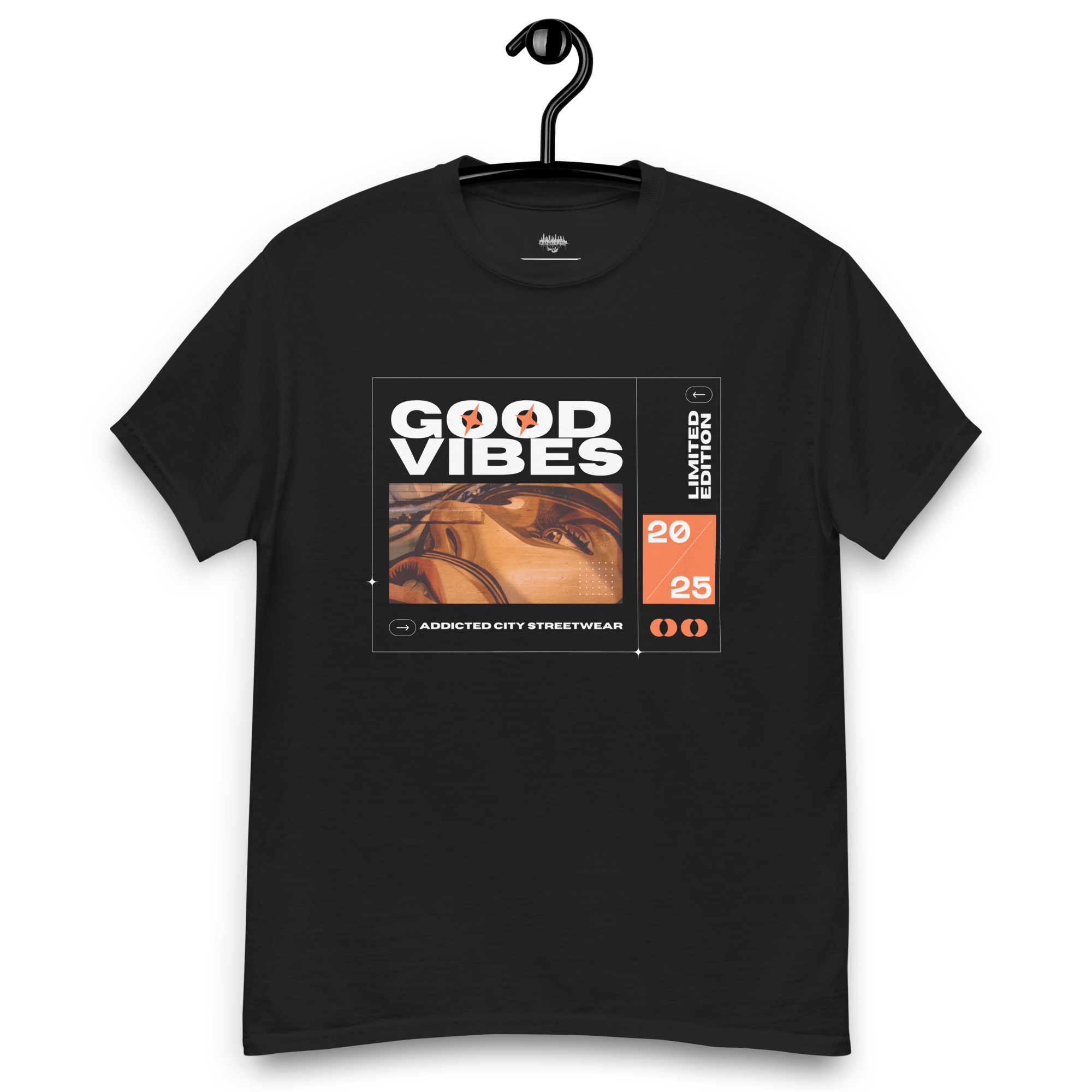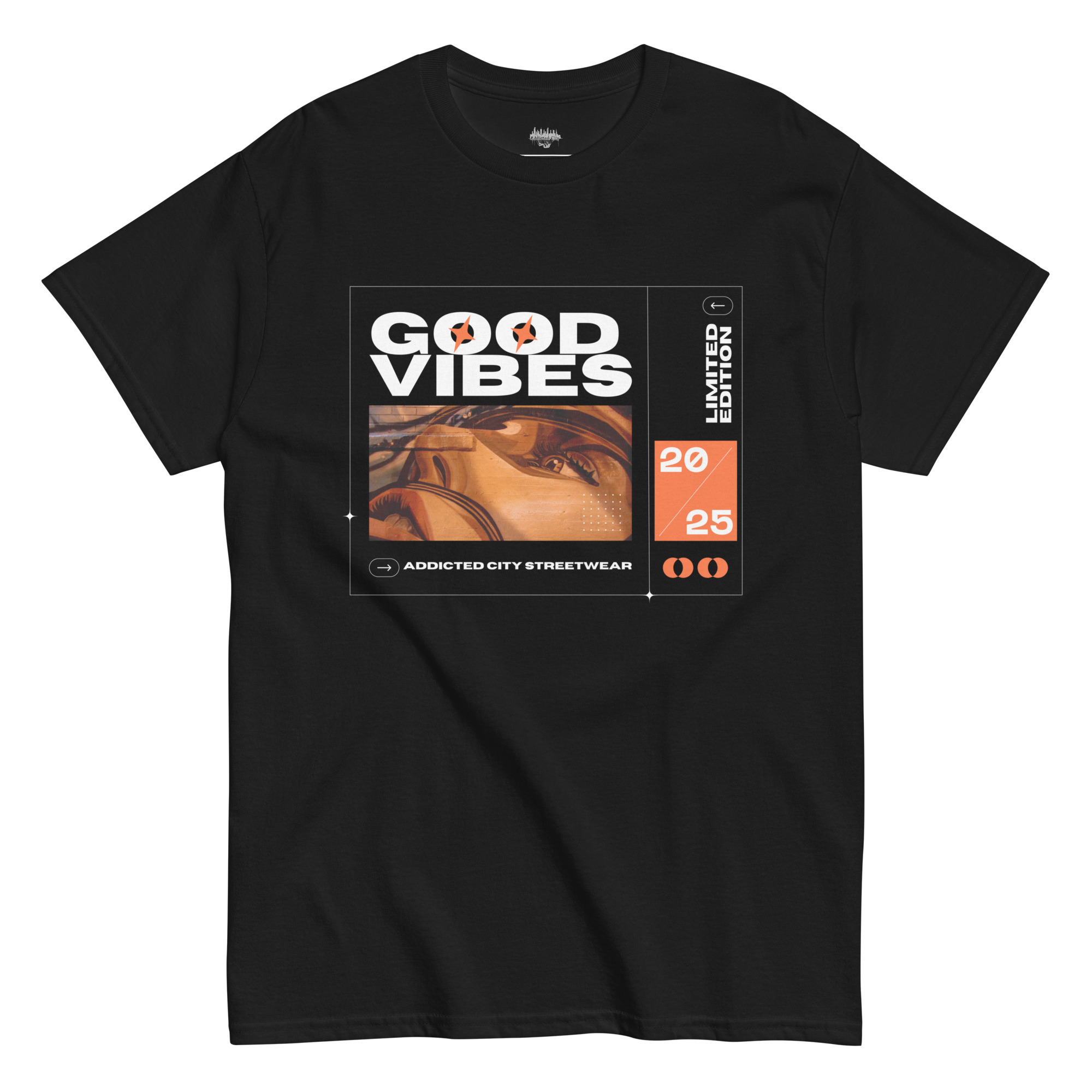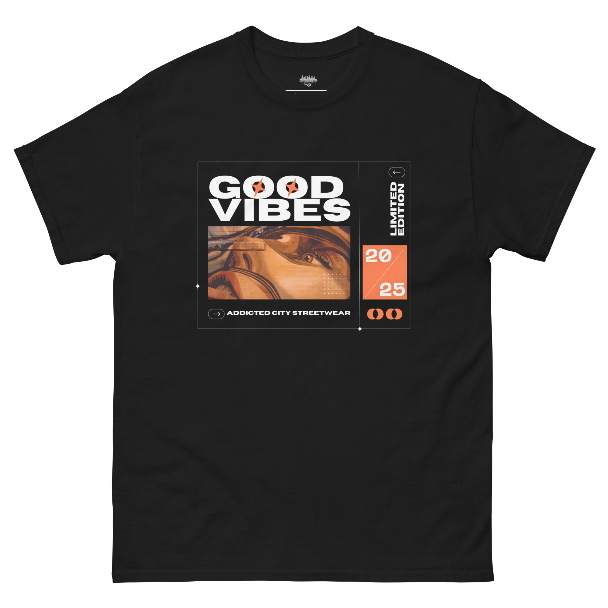 Keywords: Good Vibes t-shirt, abstract graphic tee, positive message shirt, uplifting graphic t-shirt, modern abstract design, artistic t-shirt, energetic graphic tee, trendy graphic t-shirt, casual graphic tee, comfortable cotton shirt, good vibes clothing, positive energy shirt, vibrant t-shirt, abstract art shirt, feel-good fashion.