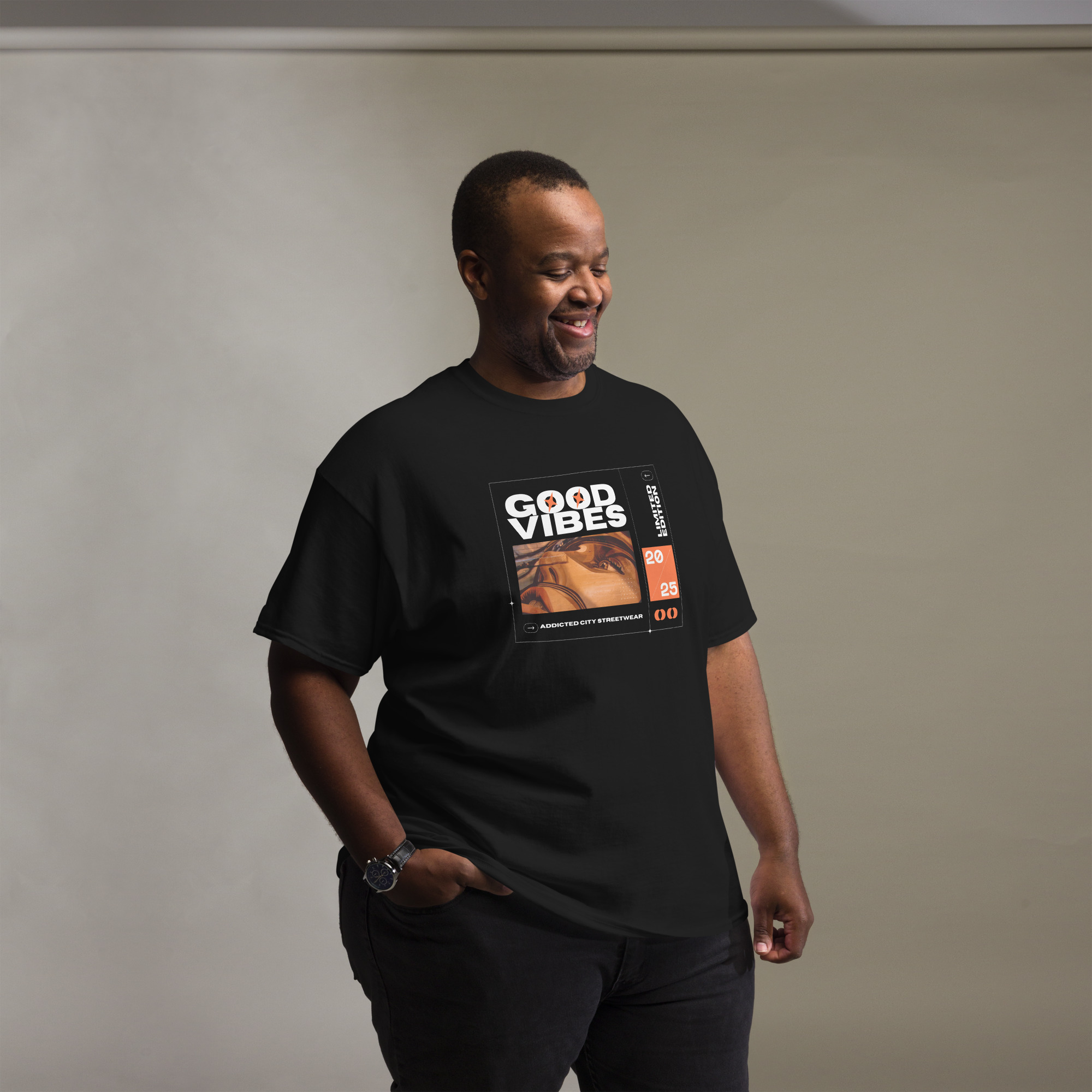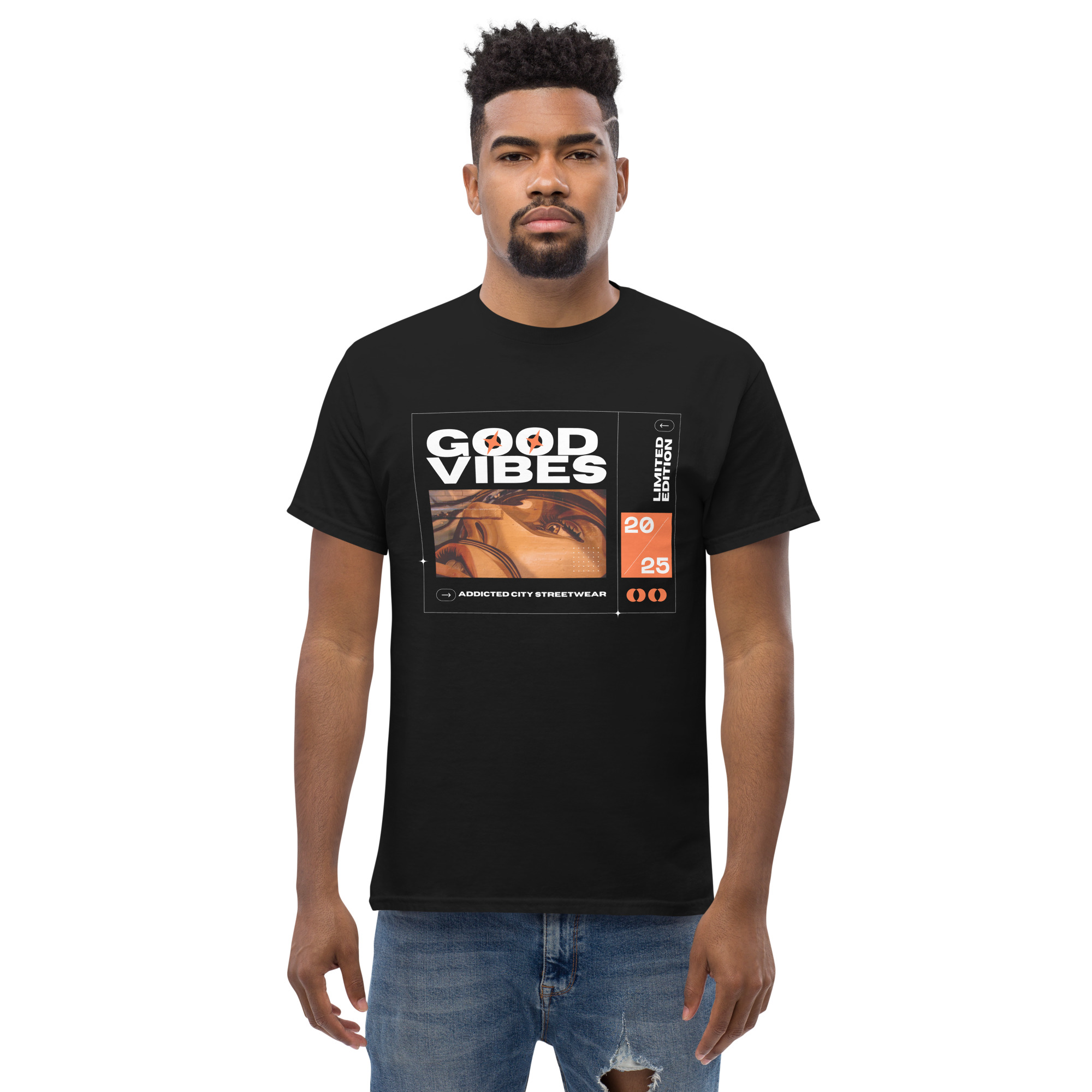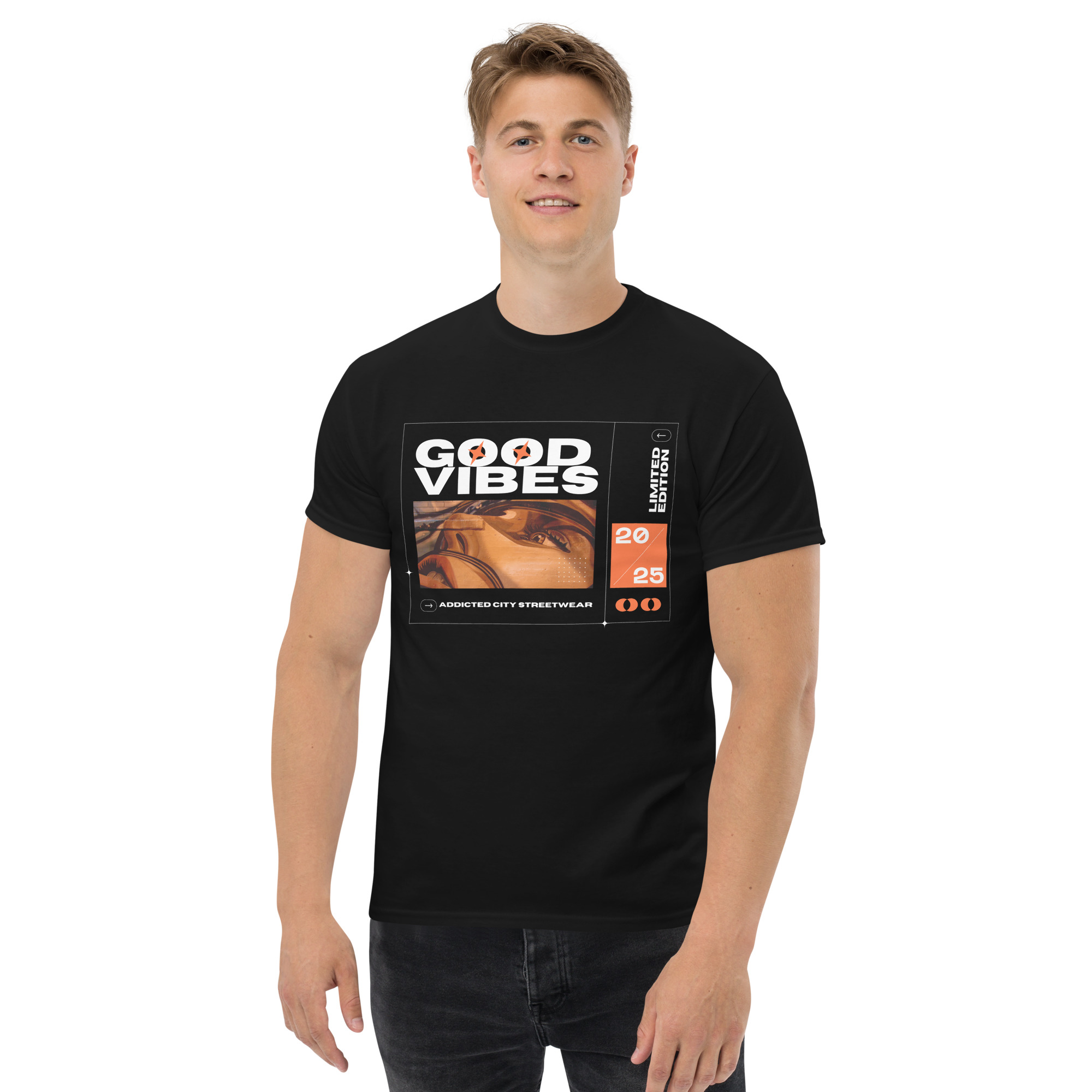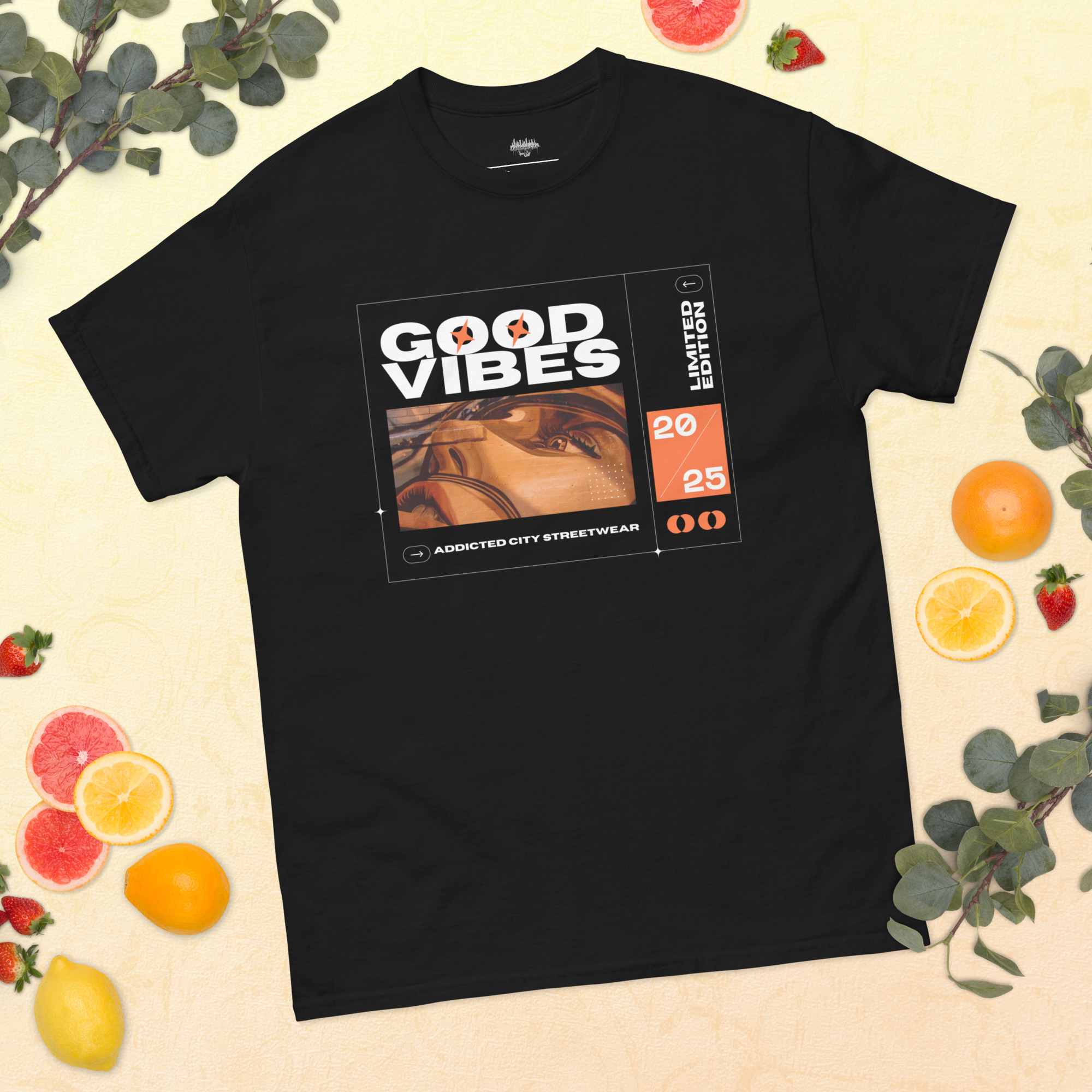 Keywords: Good Vibes t-shirt, abstract graphic tee, positive message shirt, uplifting graphic t-shirt, modern abstract design, artistic t-shirt, energetic graphic tee, trendy graphic t-shirt, casual graphic tee, comfortable cotton shirt, good vibes clothing, positive energy shirt, vibrant t-shirt, abstract art shirt, feel-good fashion.