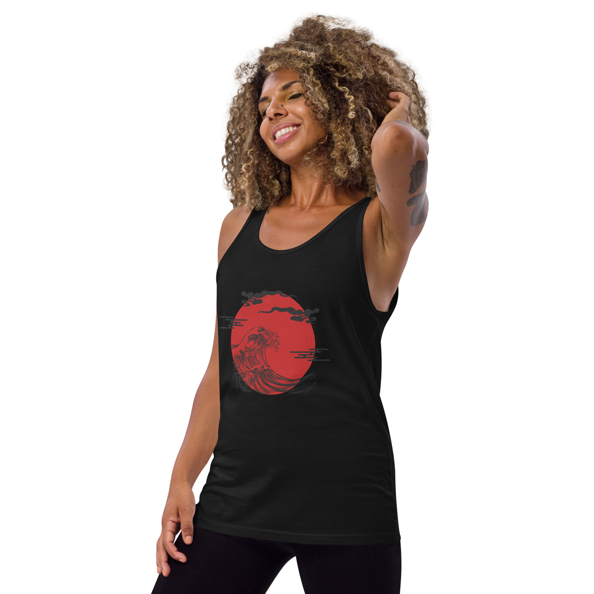 Keywords: Men’s black tank top, red moon graphic tank, waves and clouds design, Addicted City activewear, graphic tank top, workout clothing.