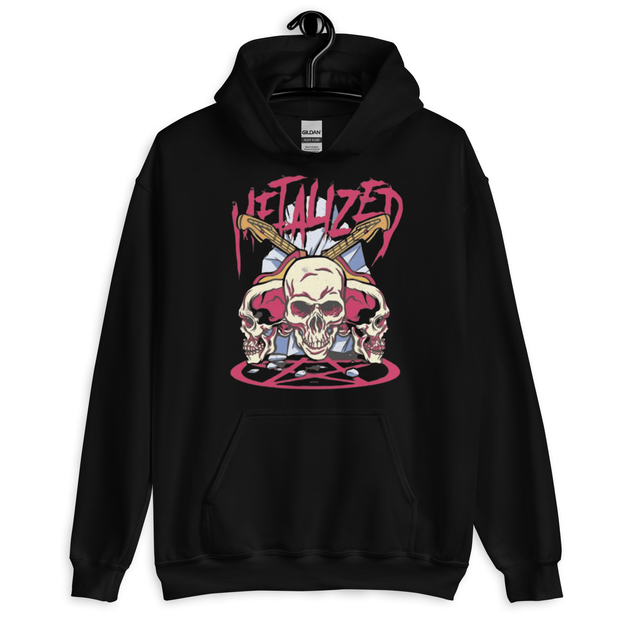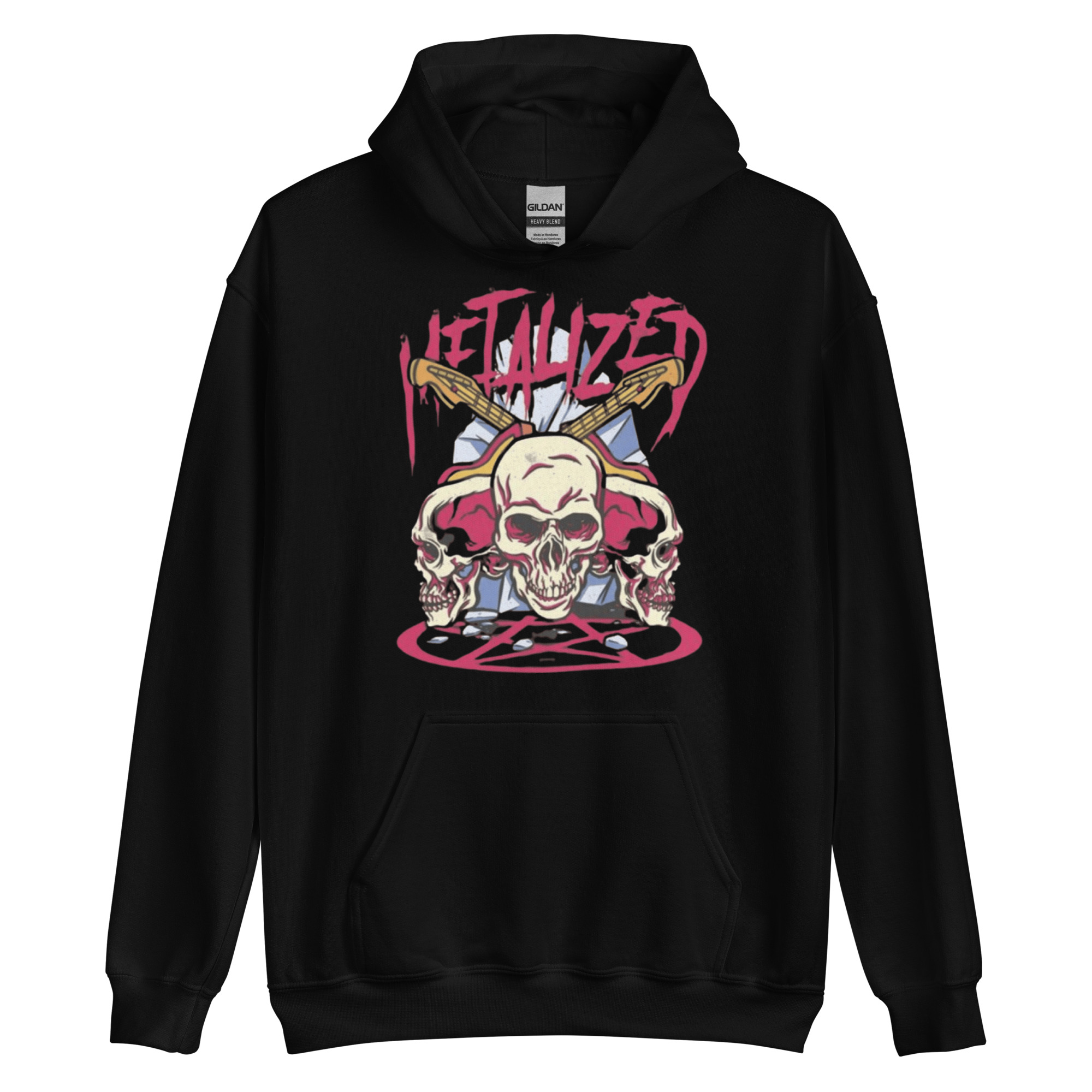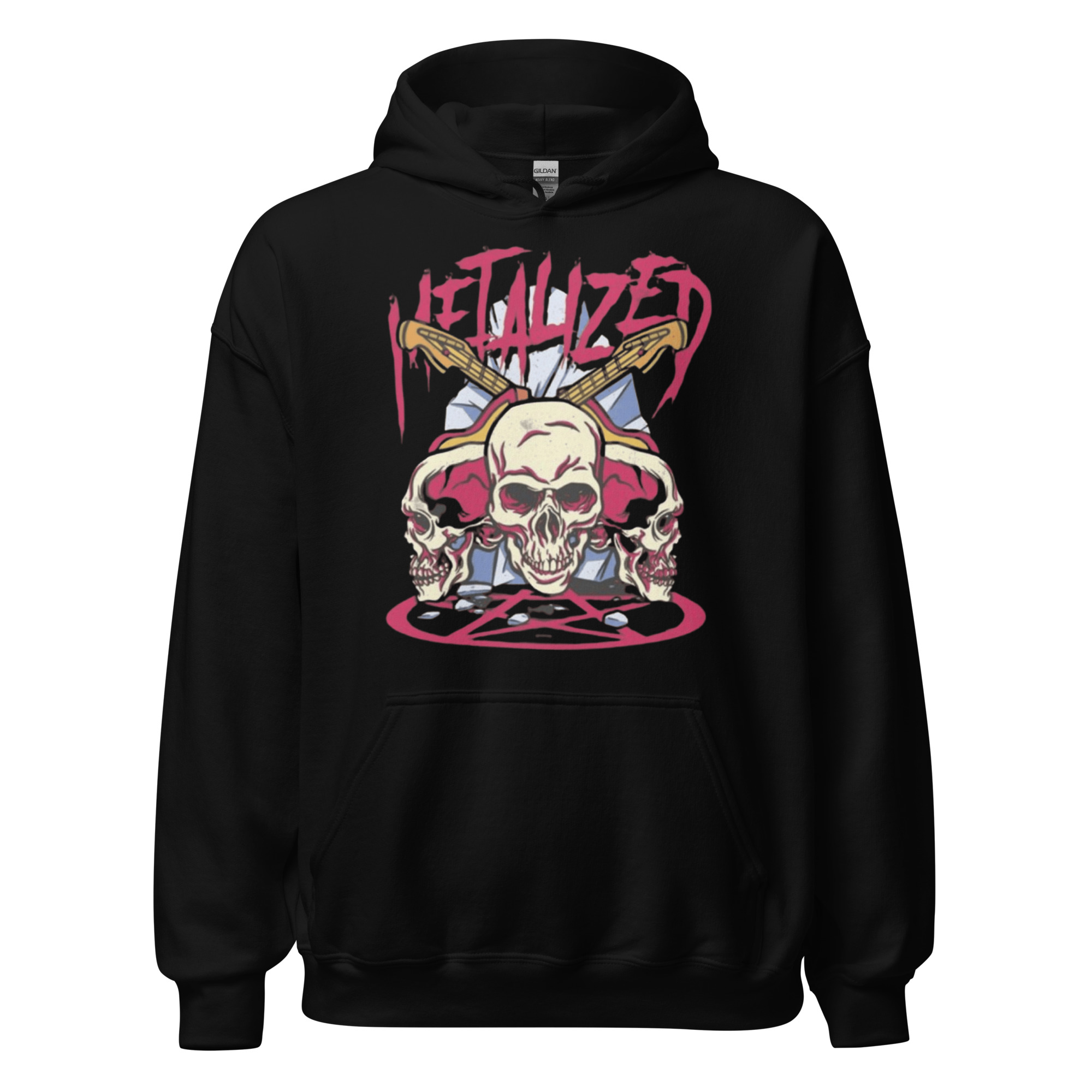 Addicted City’s black hoodie is a bold statement for metalheads and rebels alike. Featuring three intricate skulls with a striking anarchy star beneath them, this hoodie exudes an edgy, rock-inspired vibe. The word “Metalized” is emblazoned above the skulls, and two guitars cross behind the design, adding to its rebellious aesthetic. Made from high-quality fabric, it offers comfort and durability while showcasing your love for metal culture. Perfect for concerts or casual outings, this hoodie is a must-have for those who live life loud.