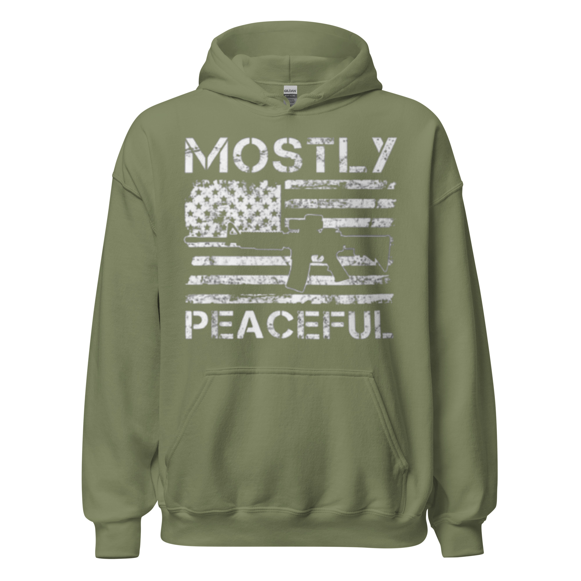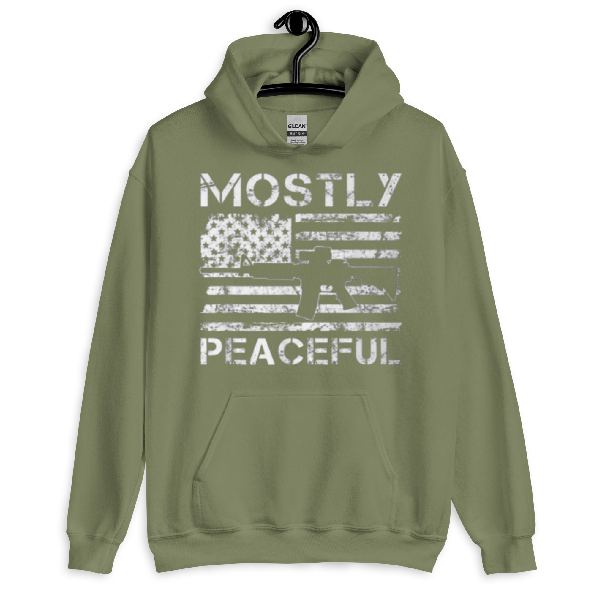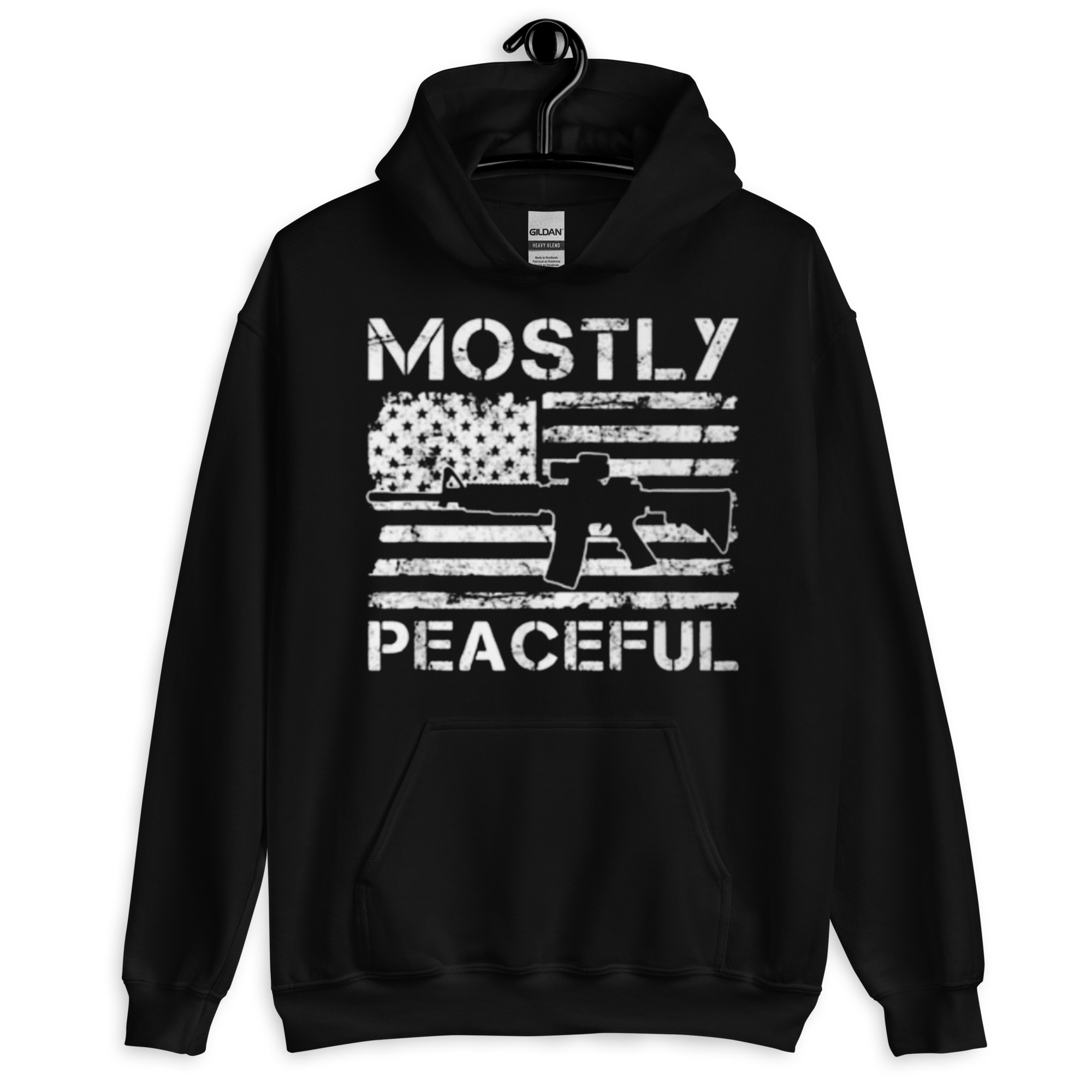 Keywords: Mostly Peaceful hoodie, Addicted City apparel, AR-15 hoodie, American flag hoodie, patriotic hoodie, bold graphic hoodie, Second Amendment hoodie, black hoodie, streetwear, political statement hoodie.