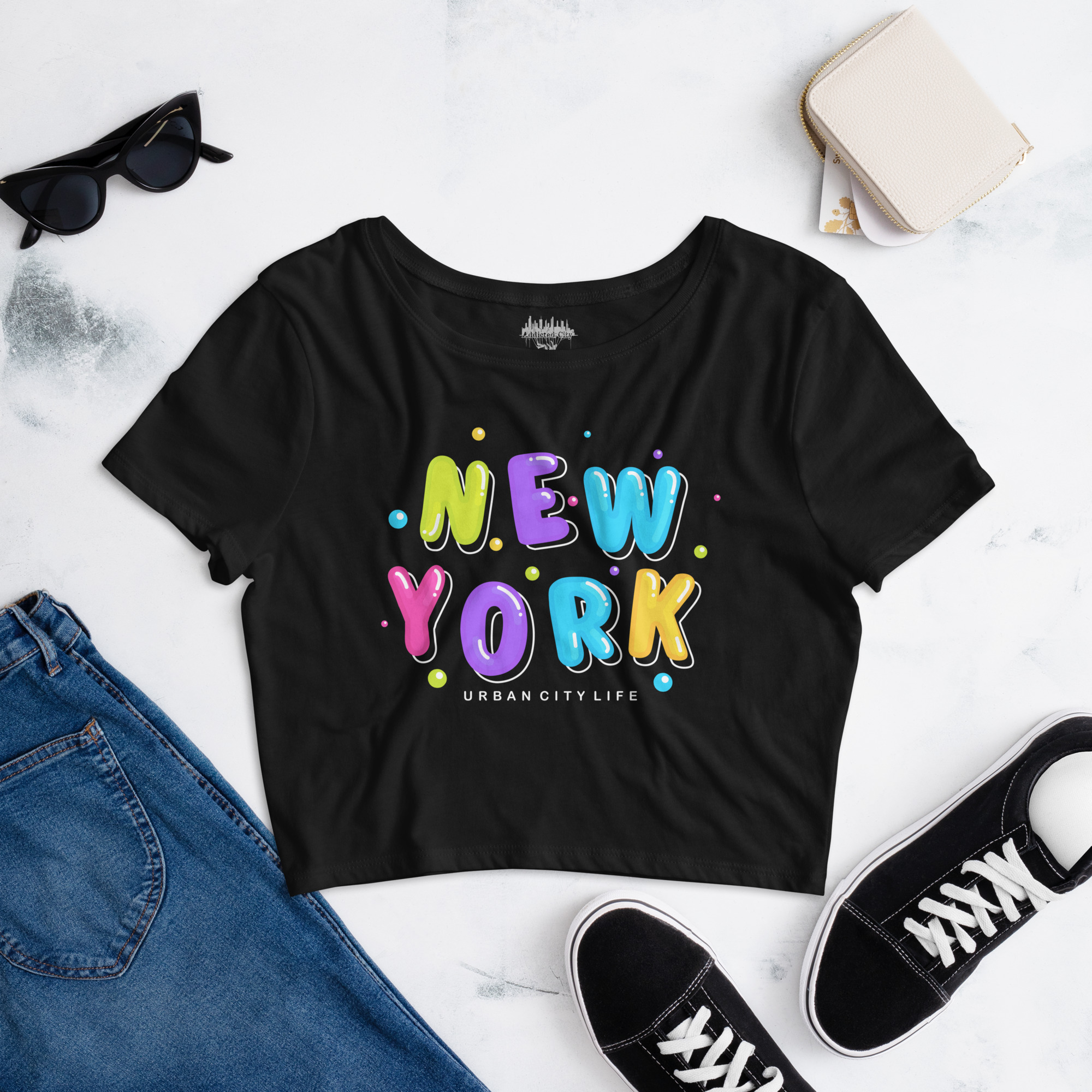 Keywords: New York crop top, Addicted City apparel, bubble letter shirt, NYC graphic crop top, women’s streetwear, trendy crop top, black crop top, urban fashion, New York pride top.