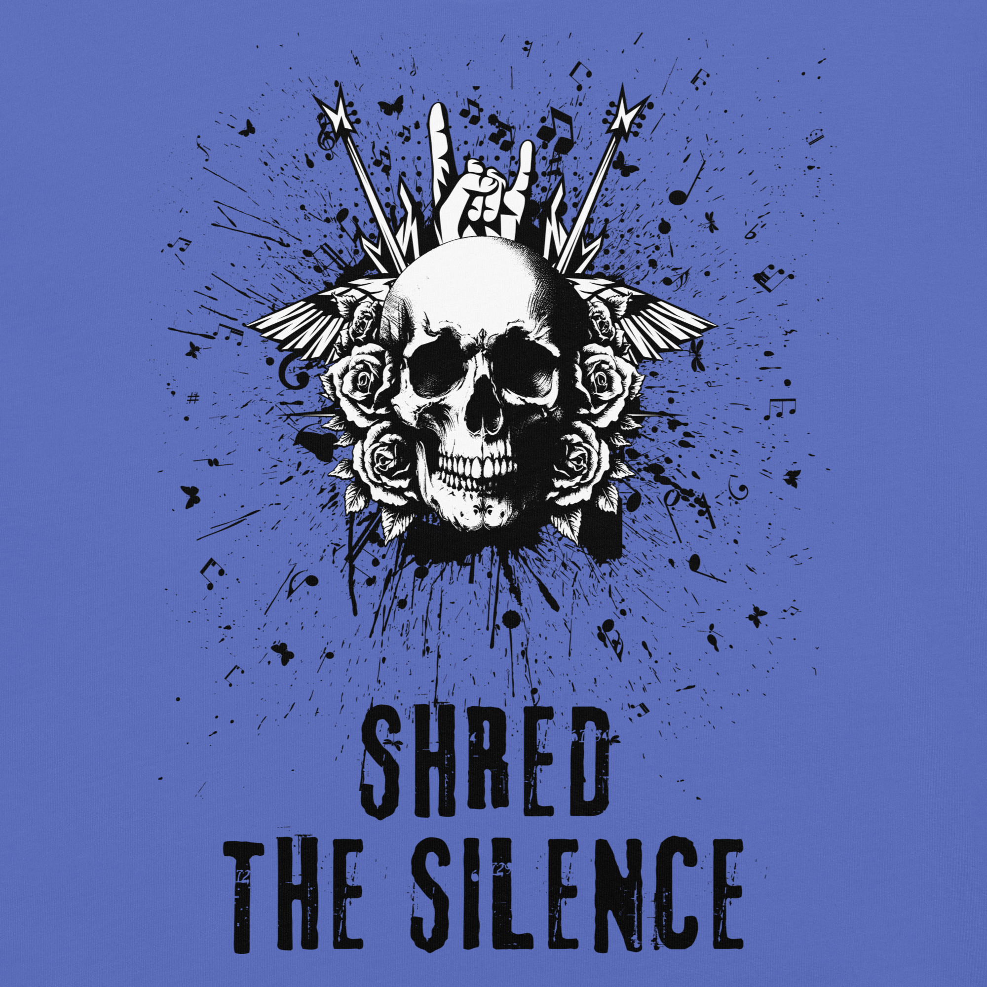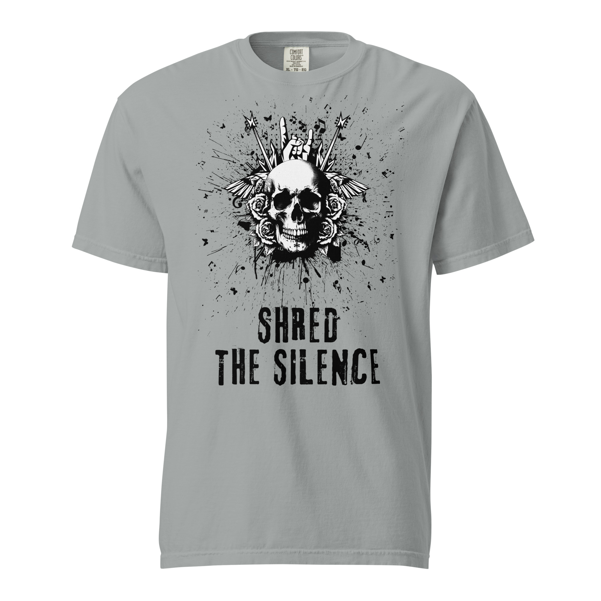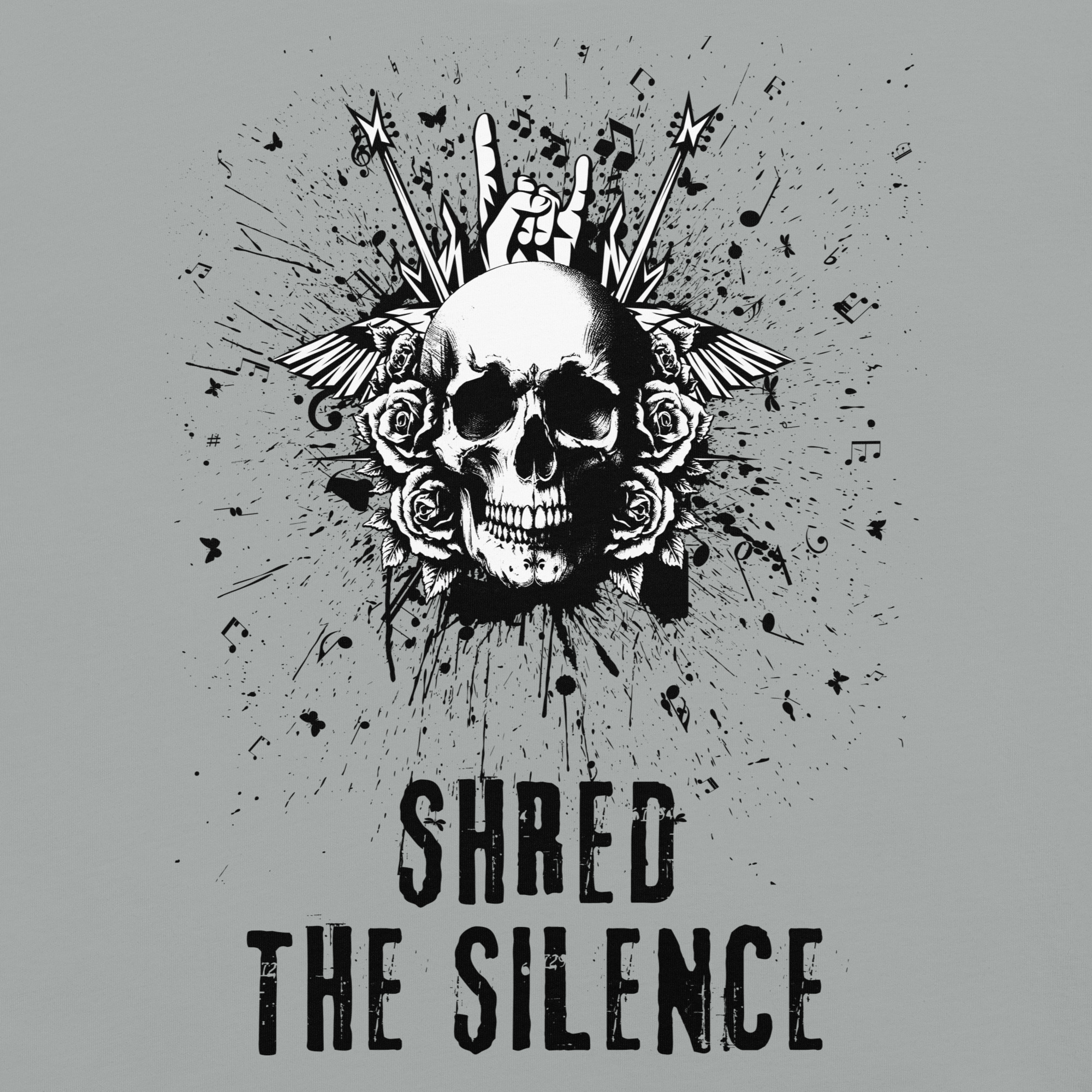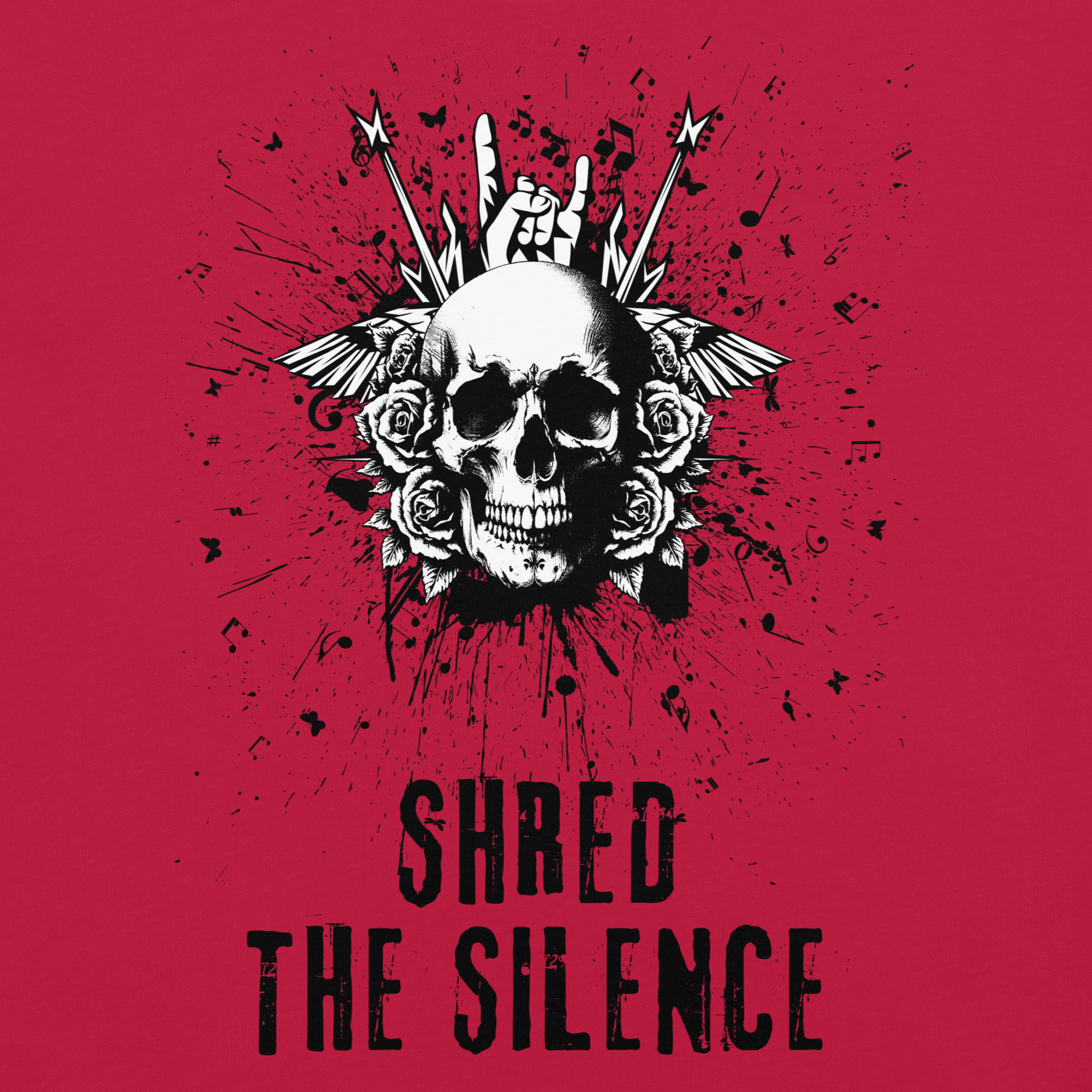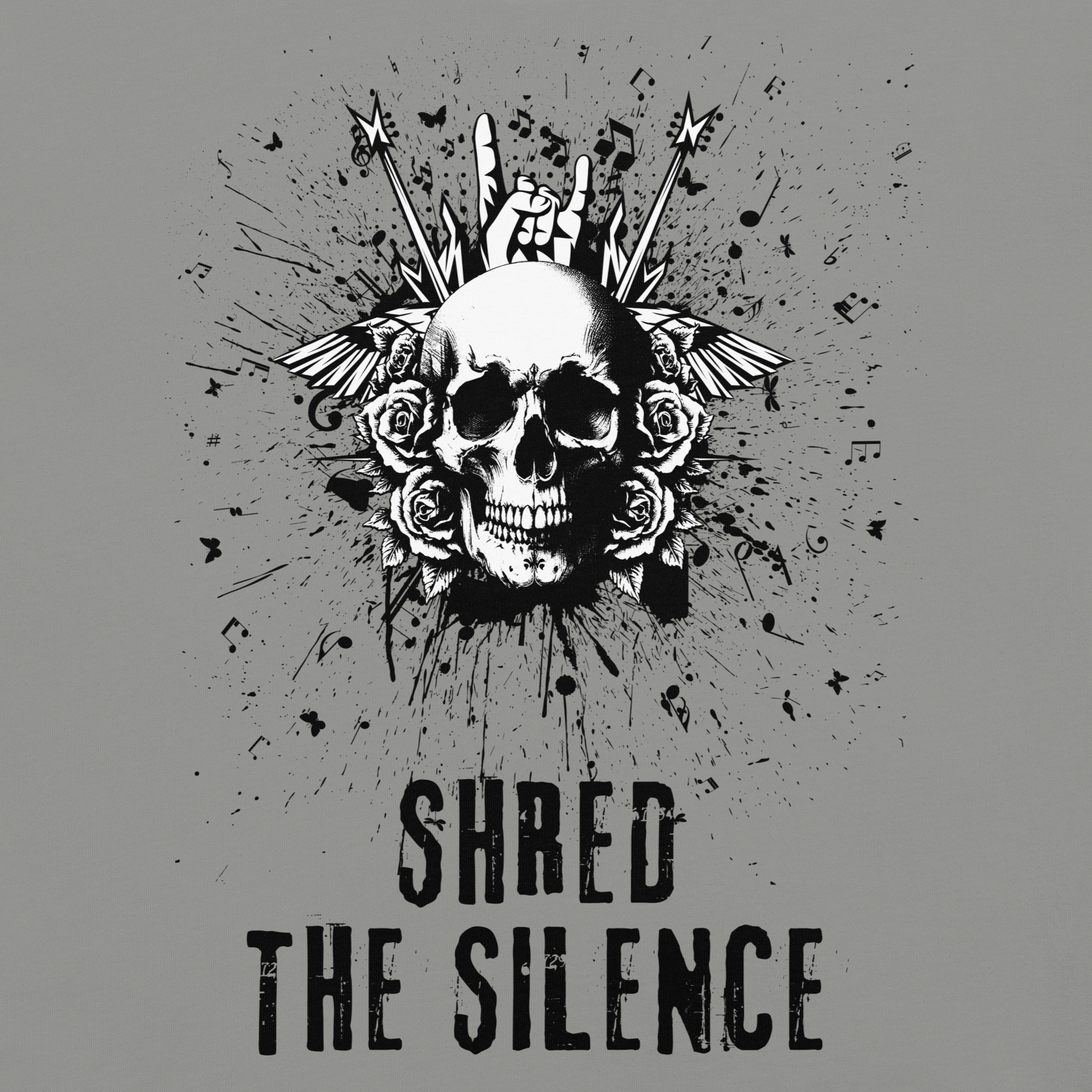 Keywords: Shred the Silence t-shirt, skull graphic tee, rebellious graphic t-shirt, punk rock shirt, alternative fashion tee, edgy streetwear, bold graphic design t-shirt, defiant message tee, skull print shirt, alternative clothing, music-inspired t-shirt, rebellious style shirt, cool graphic tee, defiance graphic shirt, skull shirt, fearless fashion.