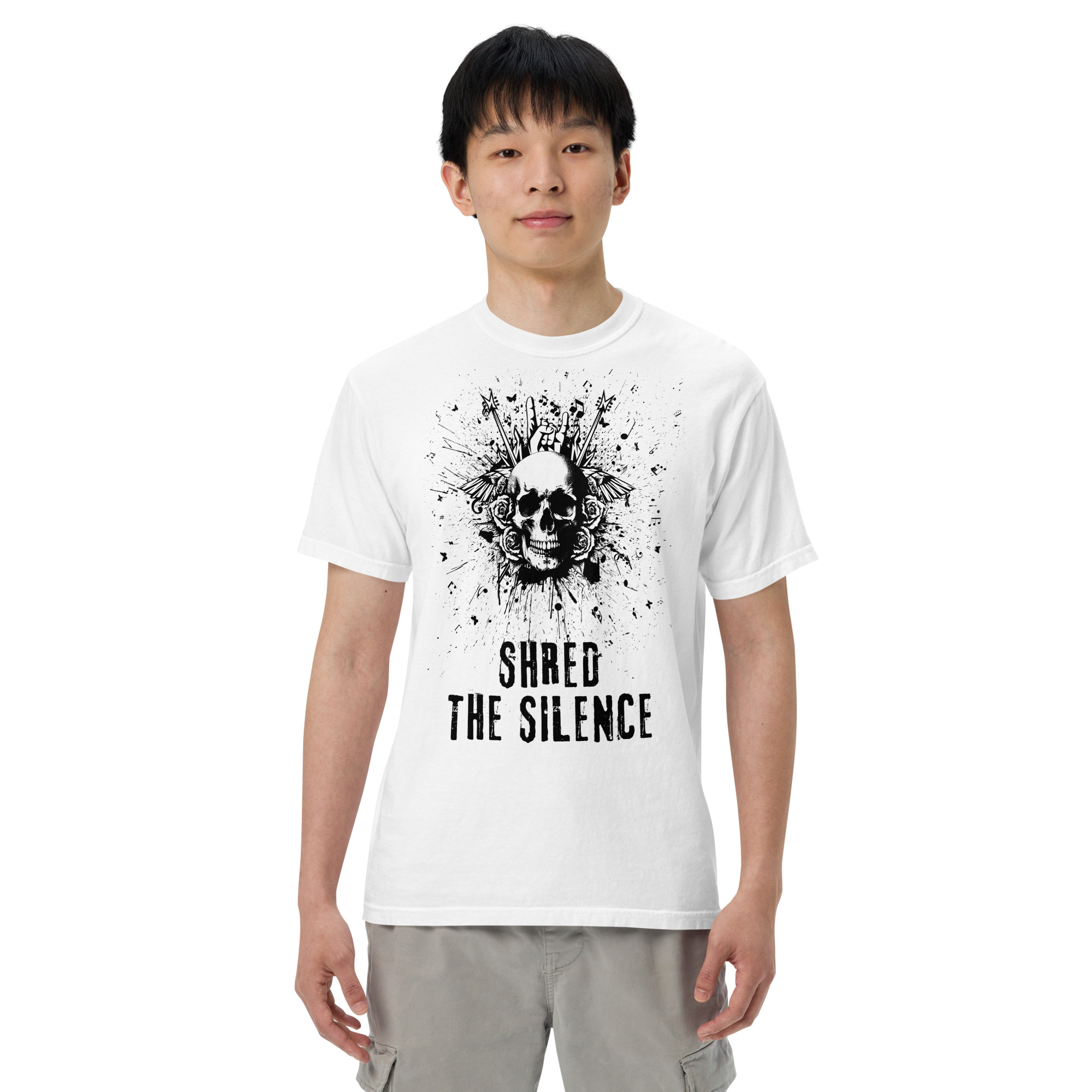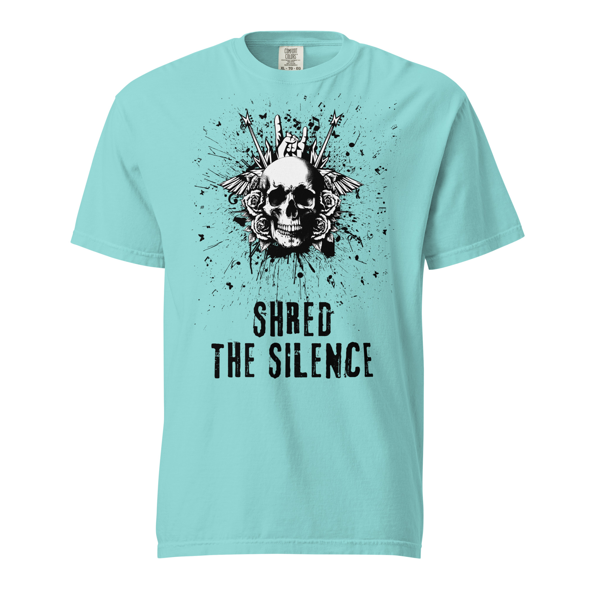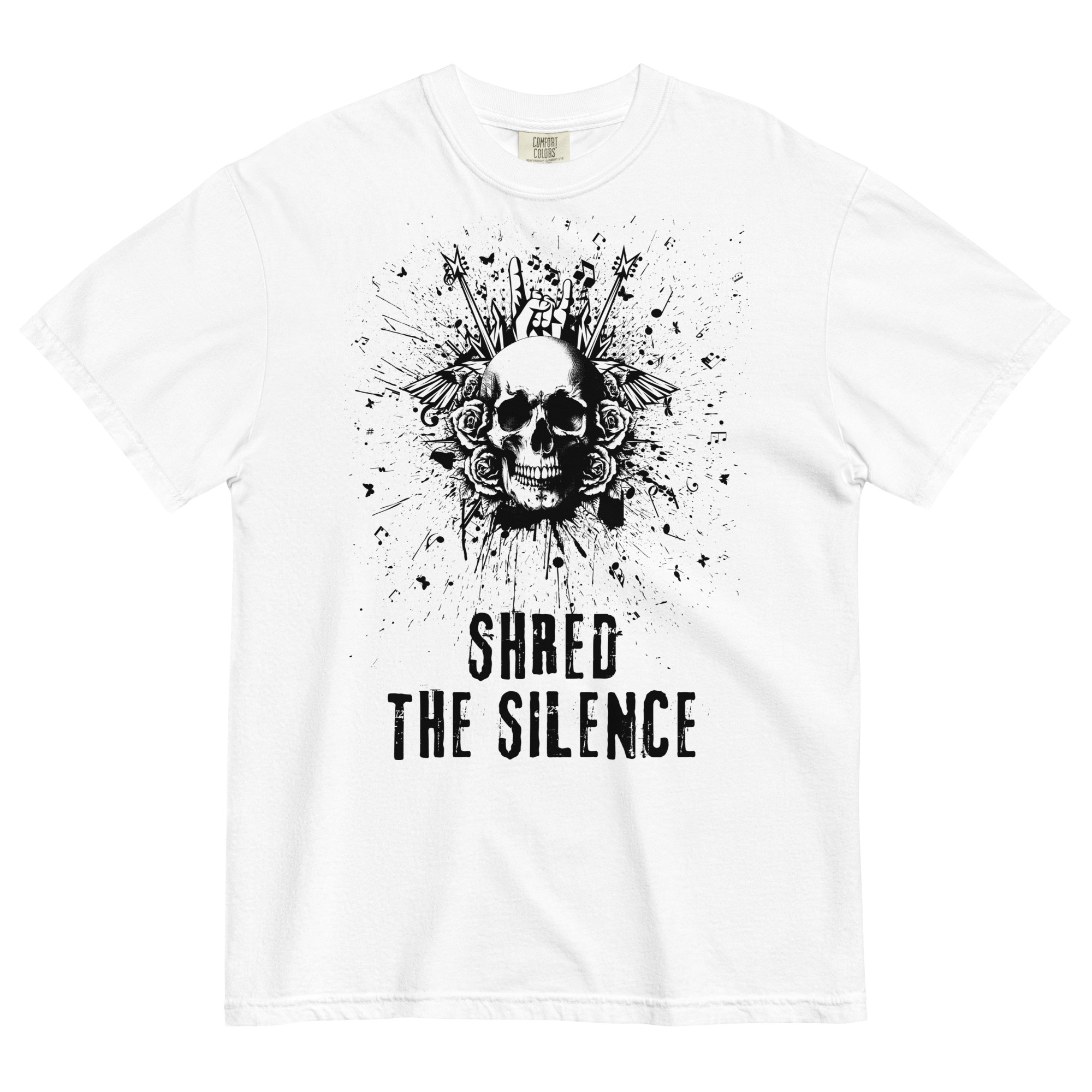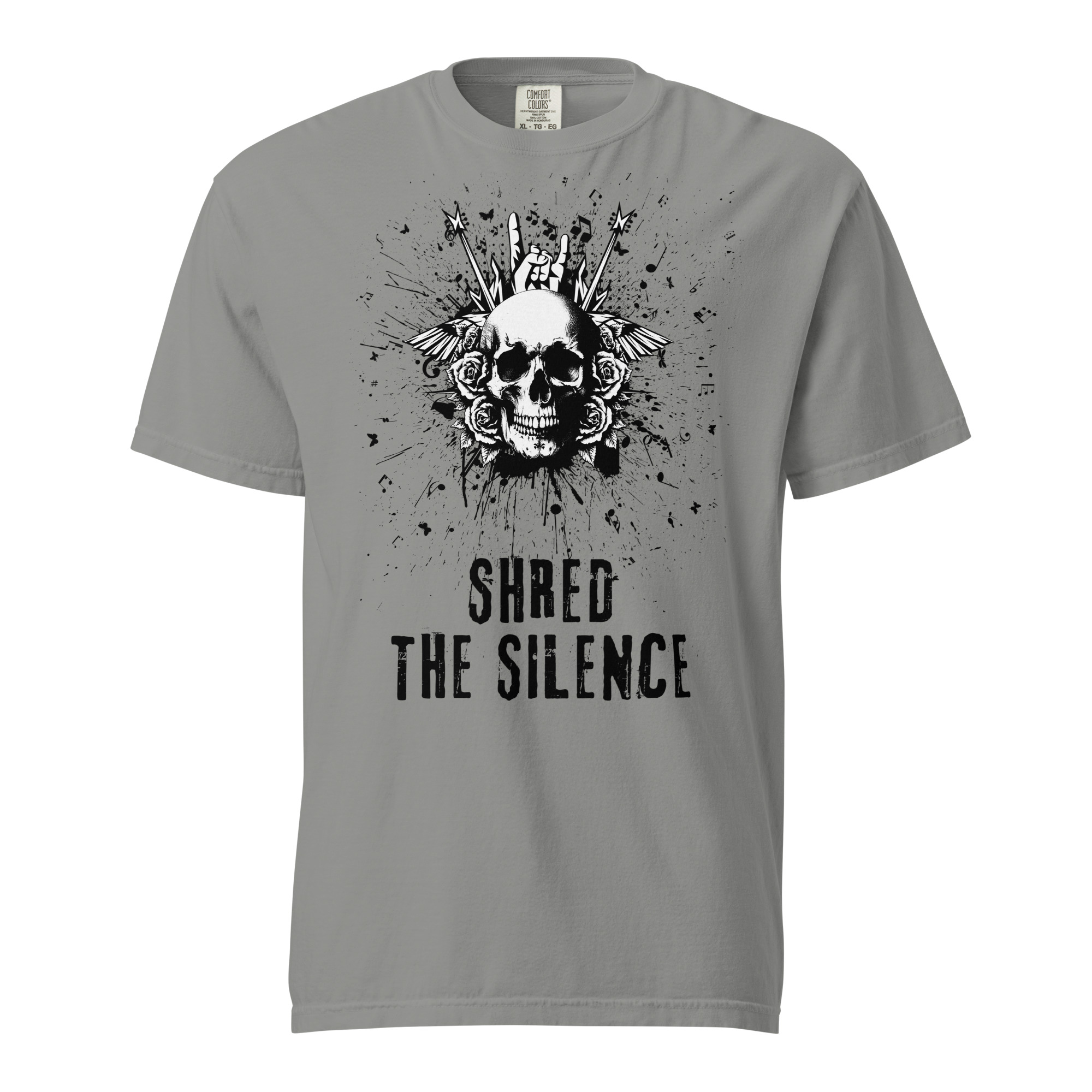 Keywords: Shred the Silence t-shirt, skull graphic tee, rebellious graphic t-shirt, punk rock shirt, alternative fashion tee, edgy streetwear, bold graphic design t-shirt, defiant message tee, skull print shirt, alternative clothing, music-inspired t-shirt, rebellious style shirt, cool graphic tee, defiance graphic shirt, skull shirt, fearless fashion.