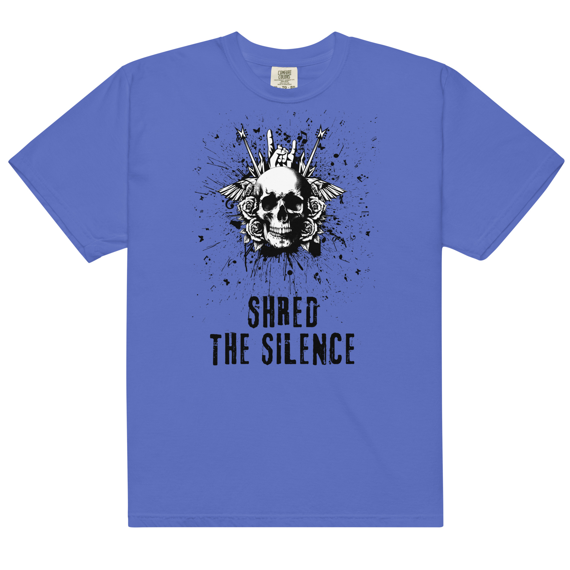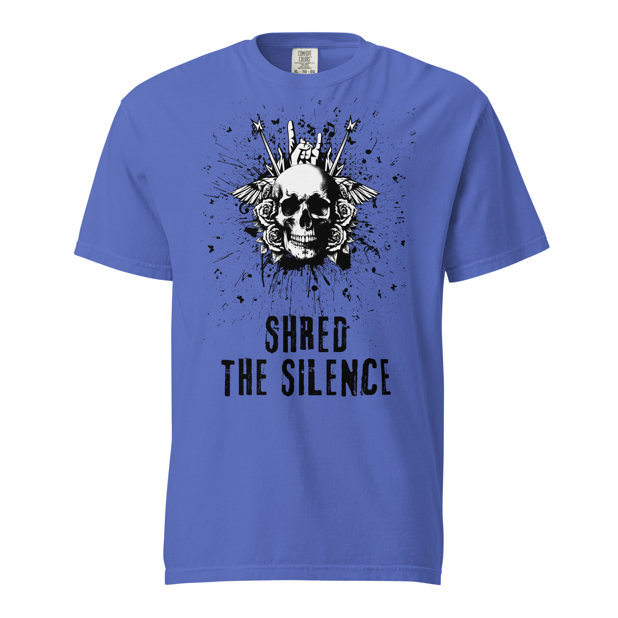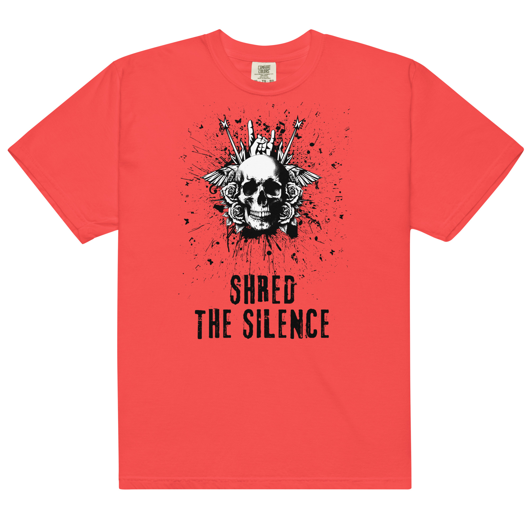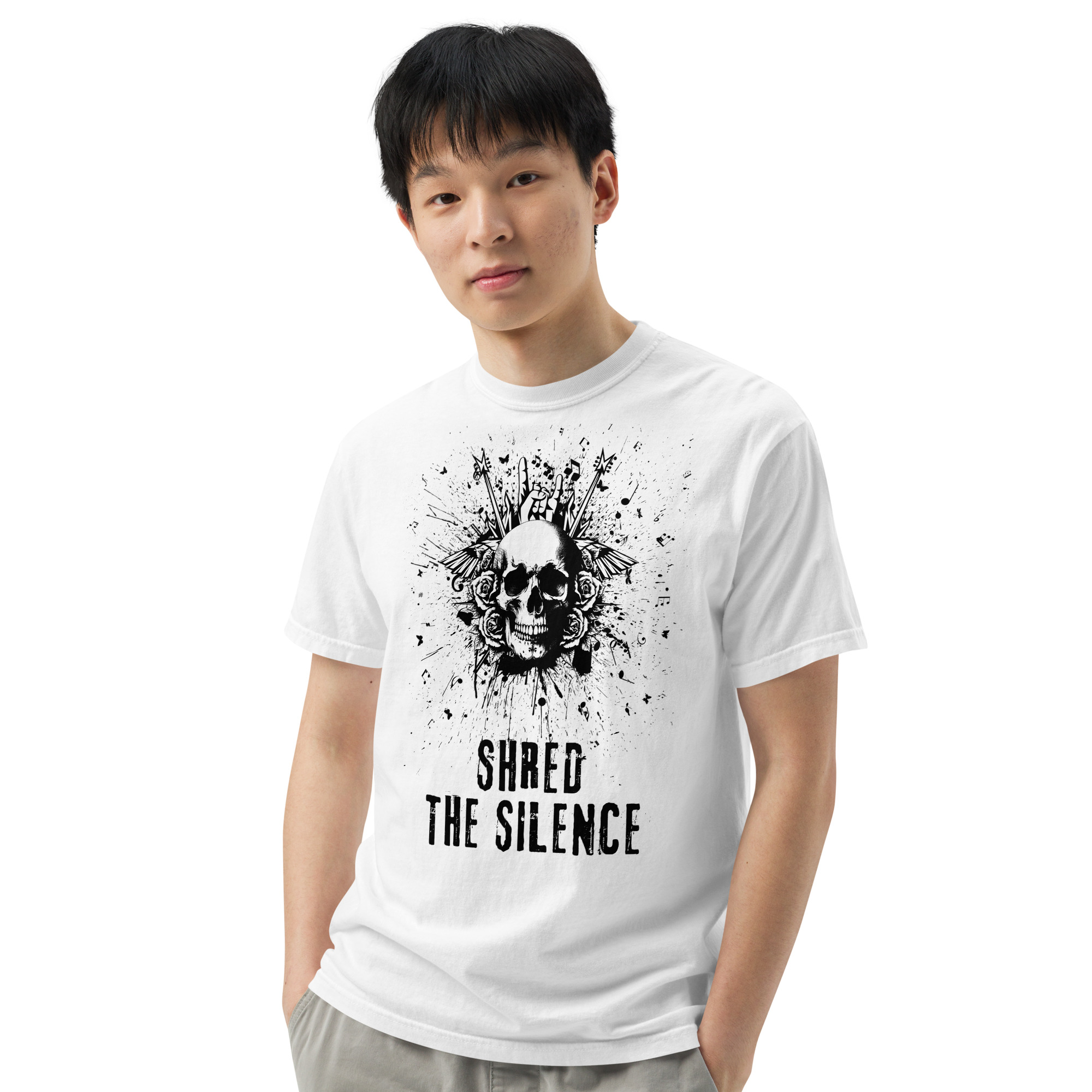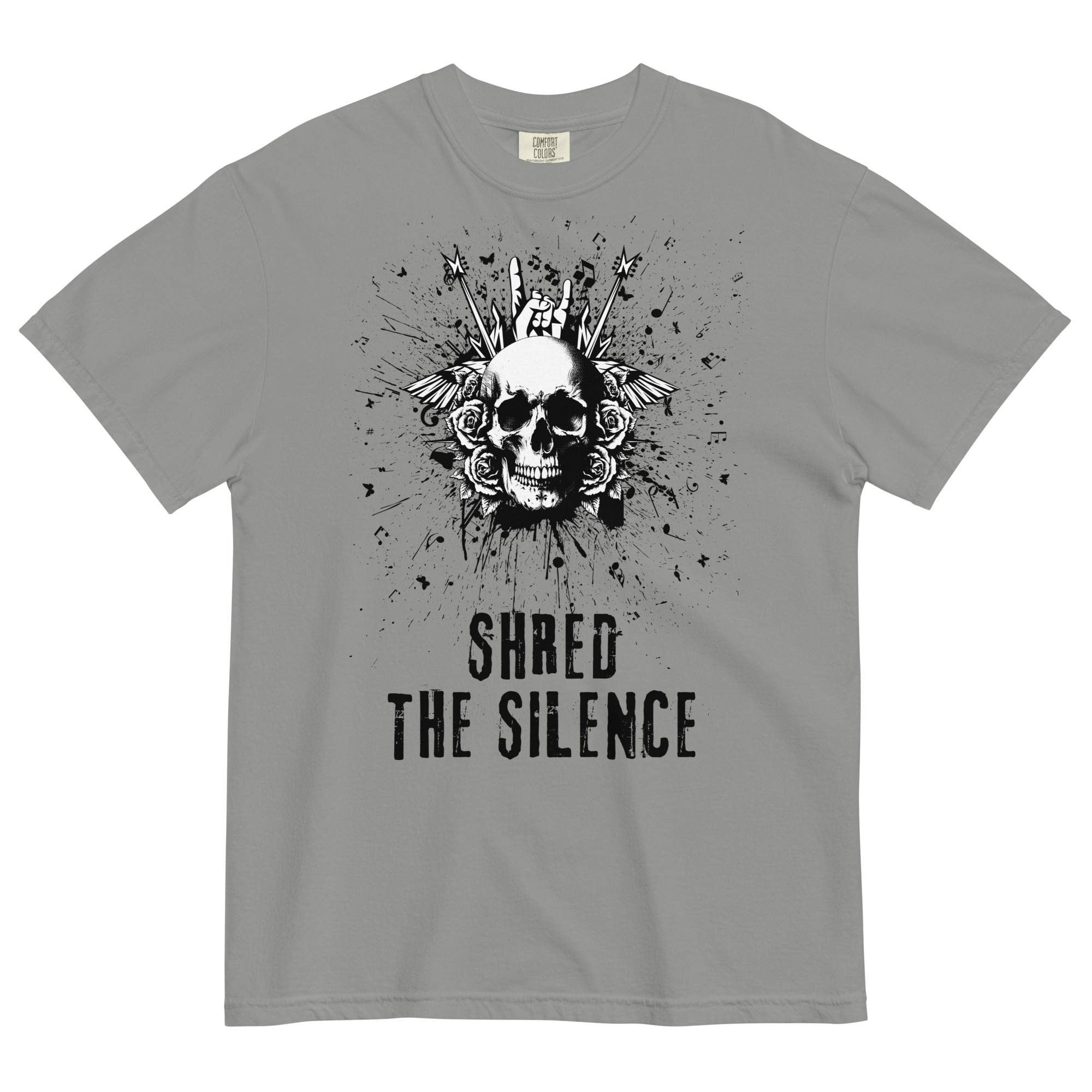 Keywords: Shred the Silence t-shirt, skull graphic tee, rebellious graphic t-shirt, punk rock shirt, alternative fashion tee, edgy streetwear, bold graphic design t-shirt, defiant message tee, skull print shirt, alternative clothing, music-inspired t-shirt, rebellious style shirt, cool graphic tee, defiance graphic shirt, skull shirt, fearless fashion.