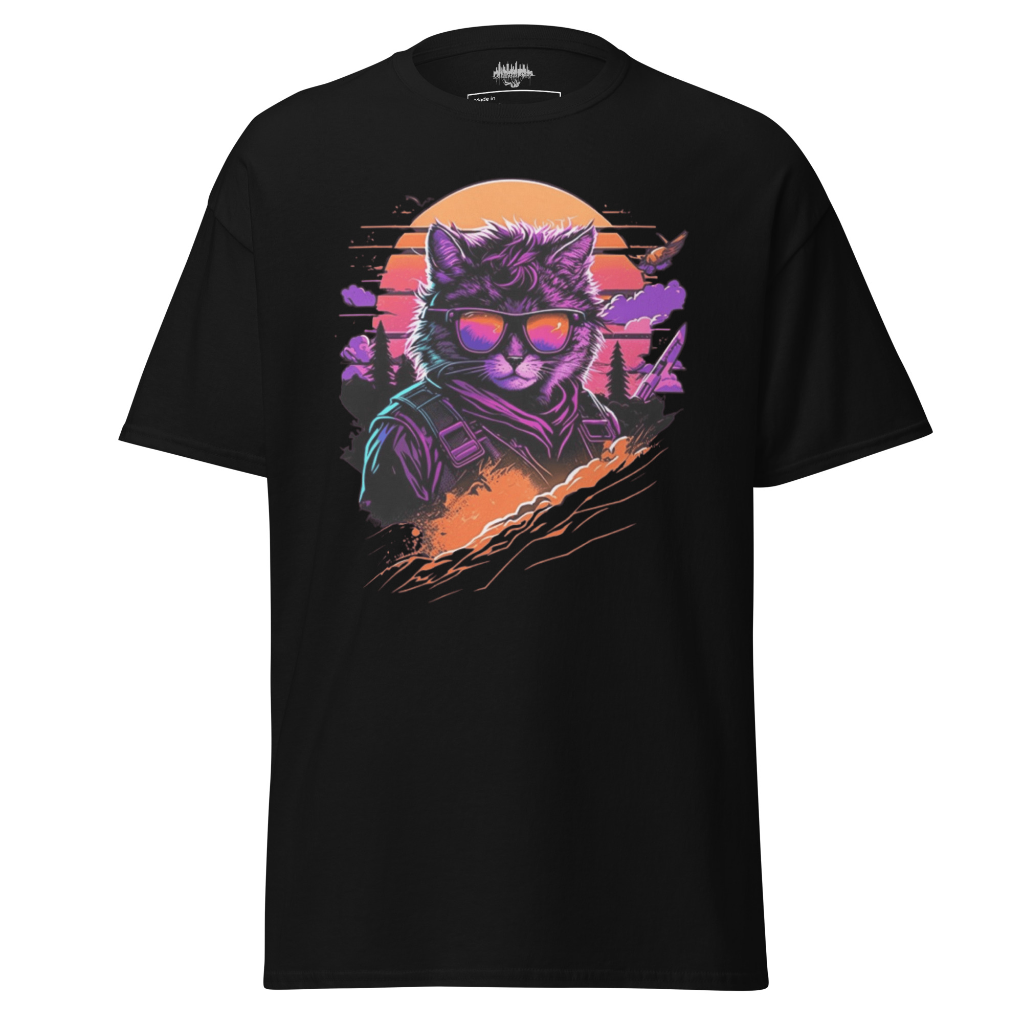 Keywords: Space Cat T-shirt, Addicted City apparel, colorful cat shirt, spaceship graphic tee, sunset design shirt, vibrant T-shirt, cat wearing spacesuit, cool cat shirt, graphic tee, streetwear.
