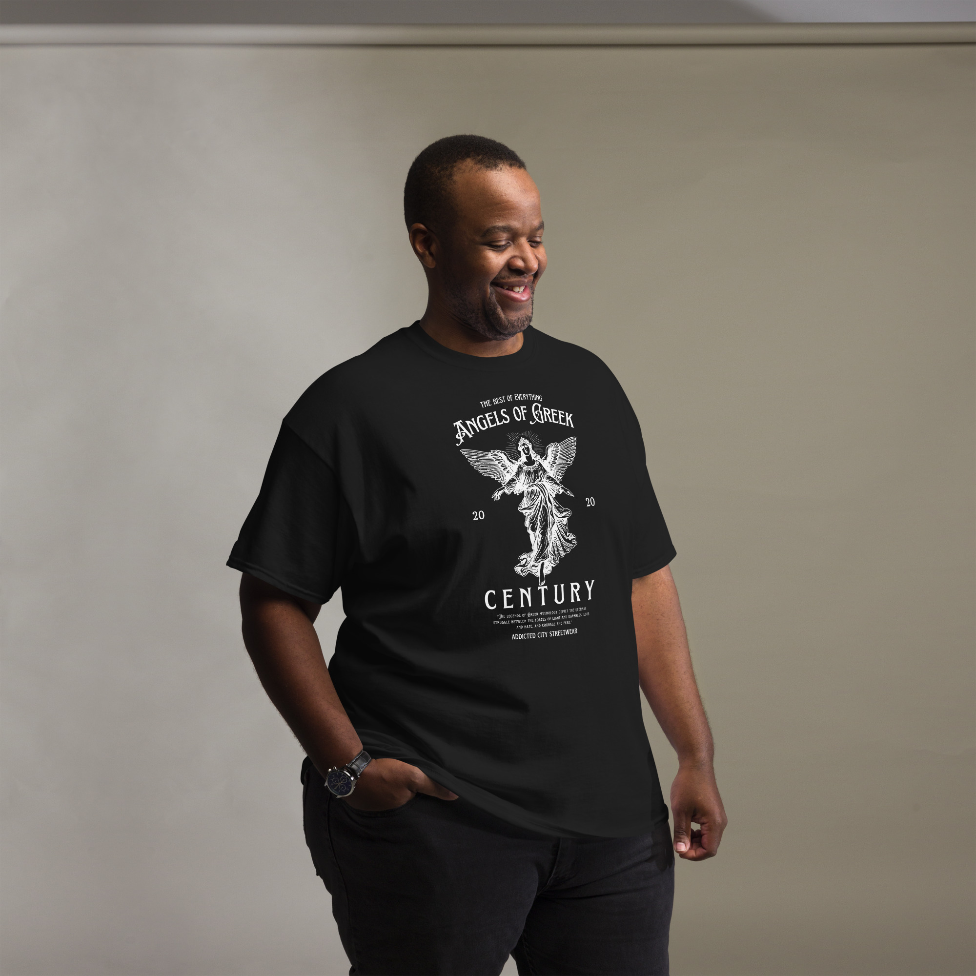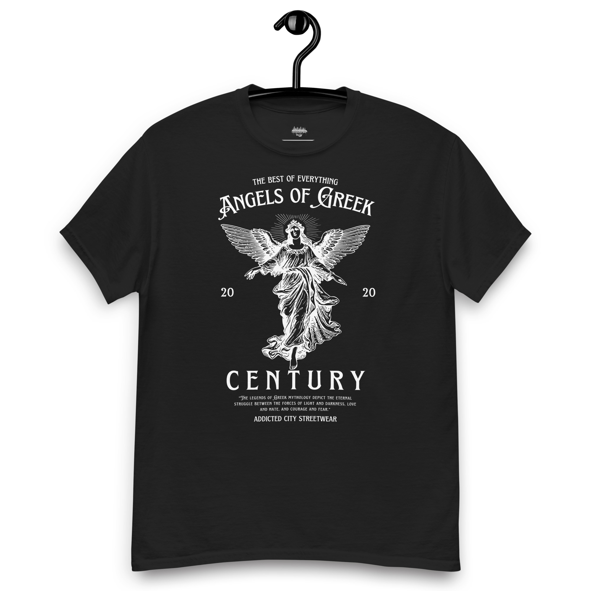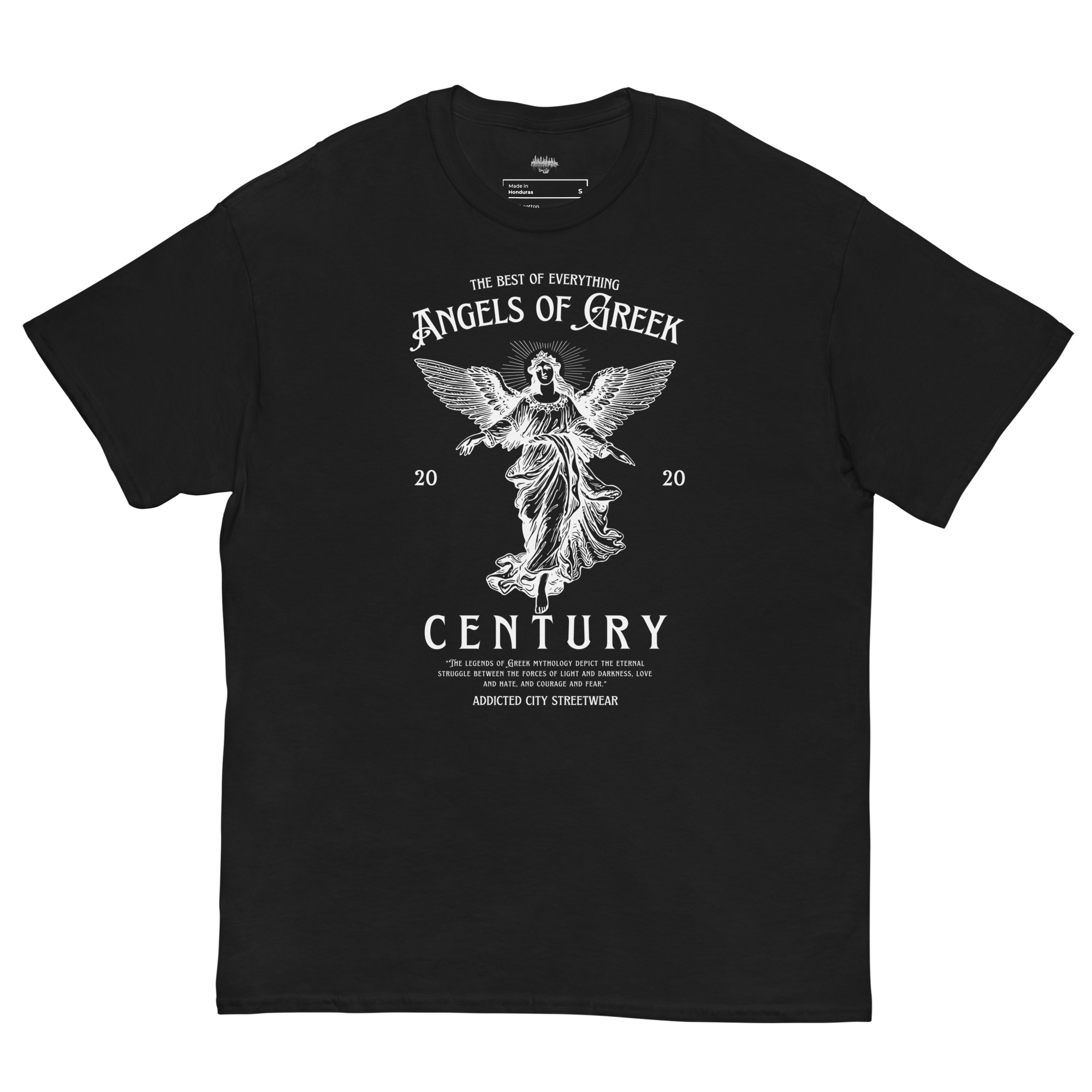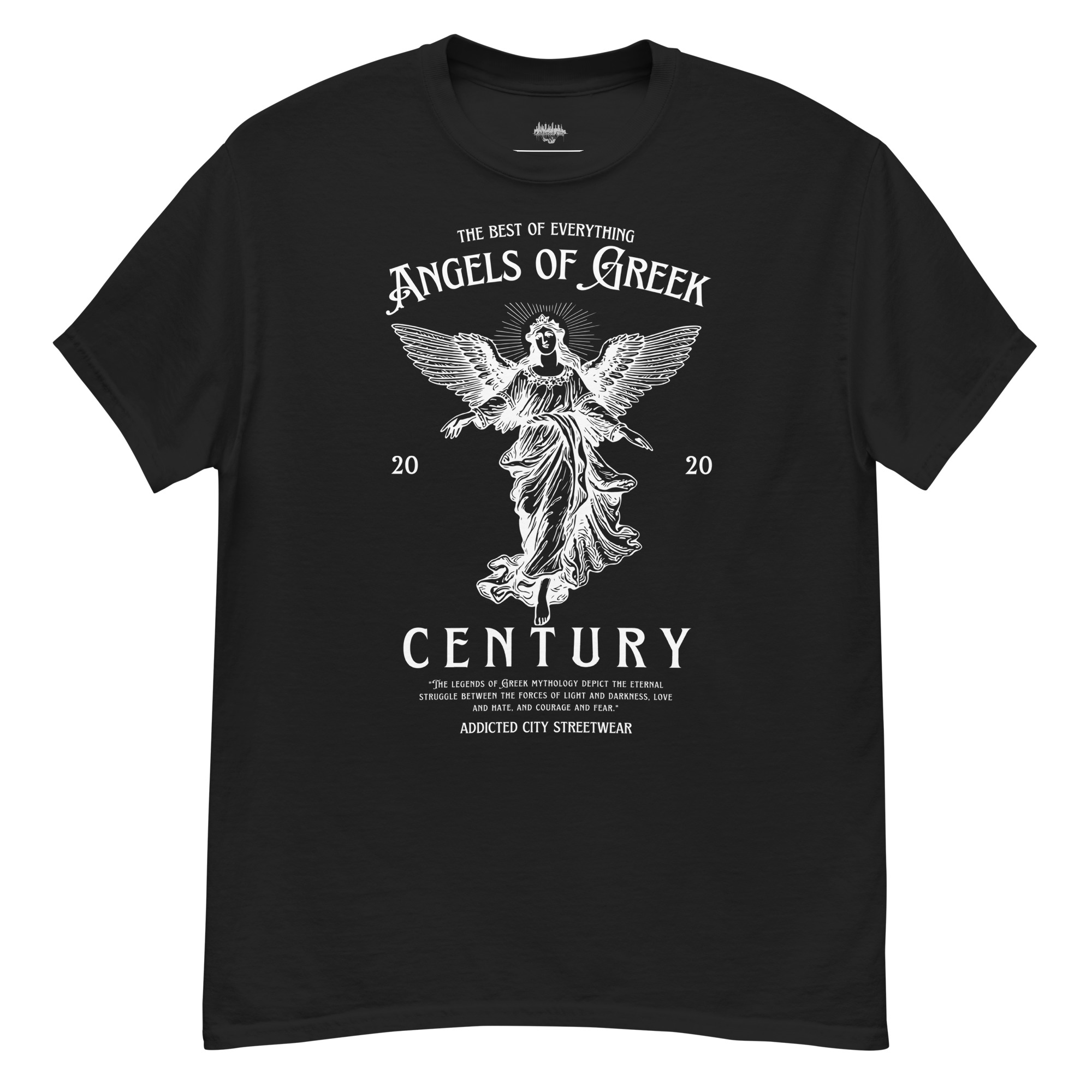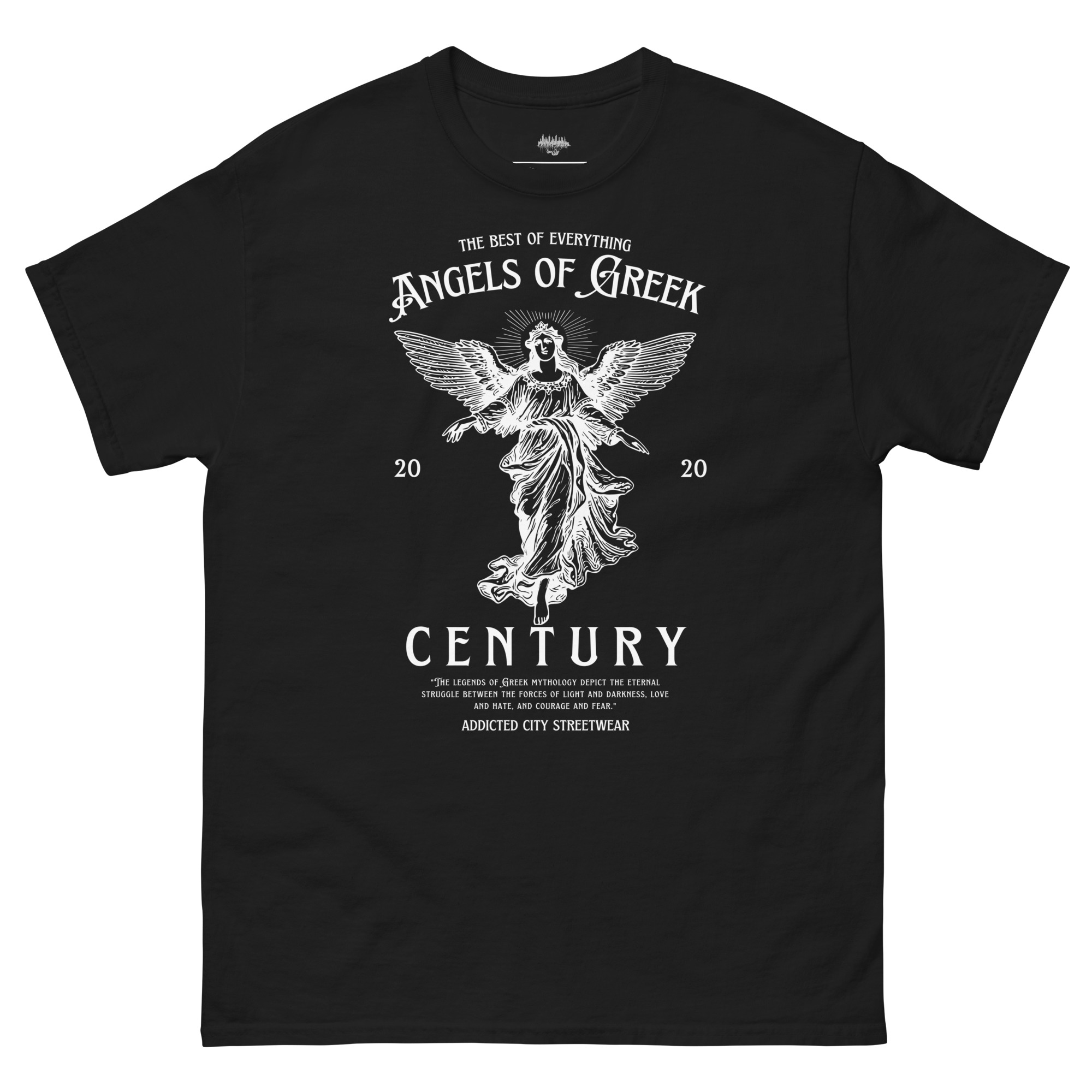 Keywords: Angels of Greek Century t-shirt, Greek mythology t-shirt, Addicted City graphic tee, modern streetwear t-shirt, mythological graphic tee, divine angels shirt, Greek legends clothing, urban mythology t-shirt, powerful graphic t-shirt, Addicted City brand t-shirt, angel graphic shirt, meaningful graphic tee, mythology-inspired streetwear, unique graphic tee.