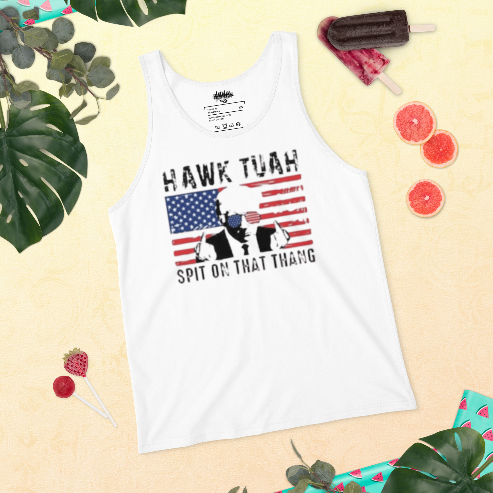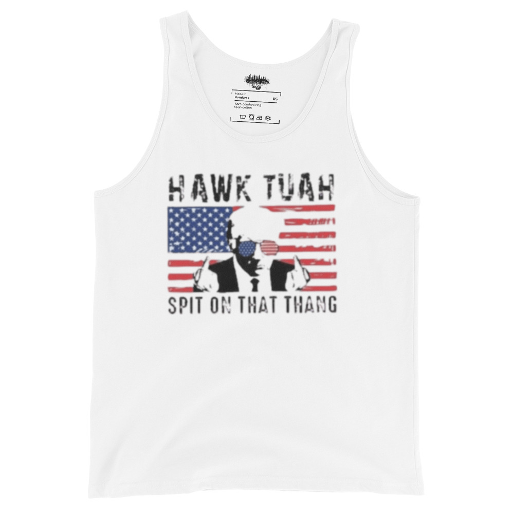 Keywords: Men’s black tank top, Trump graphic tank, American flag tank, Hawk Tuah Spit on that Thang, Addicted City activewear, statement tank top.