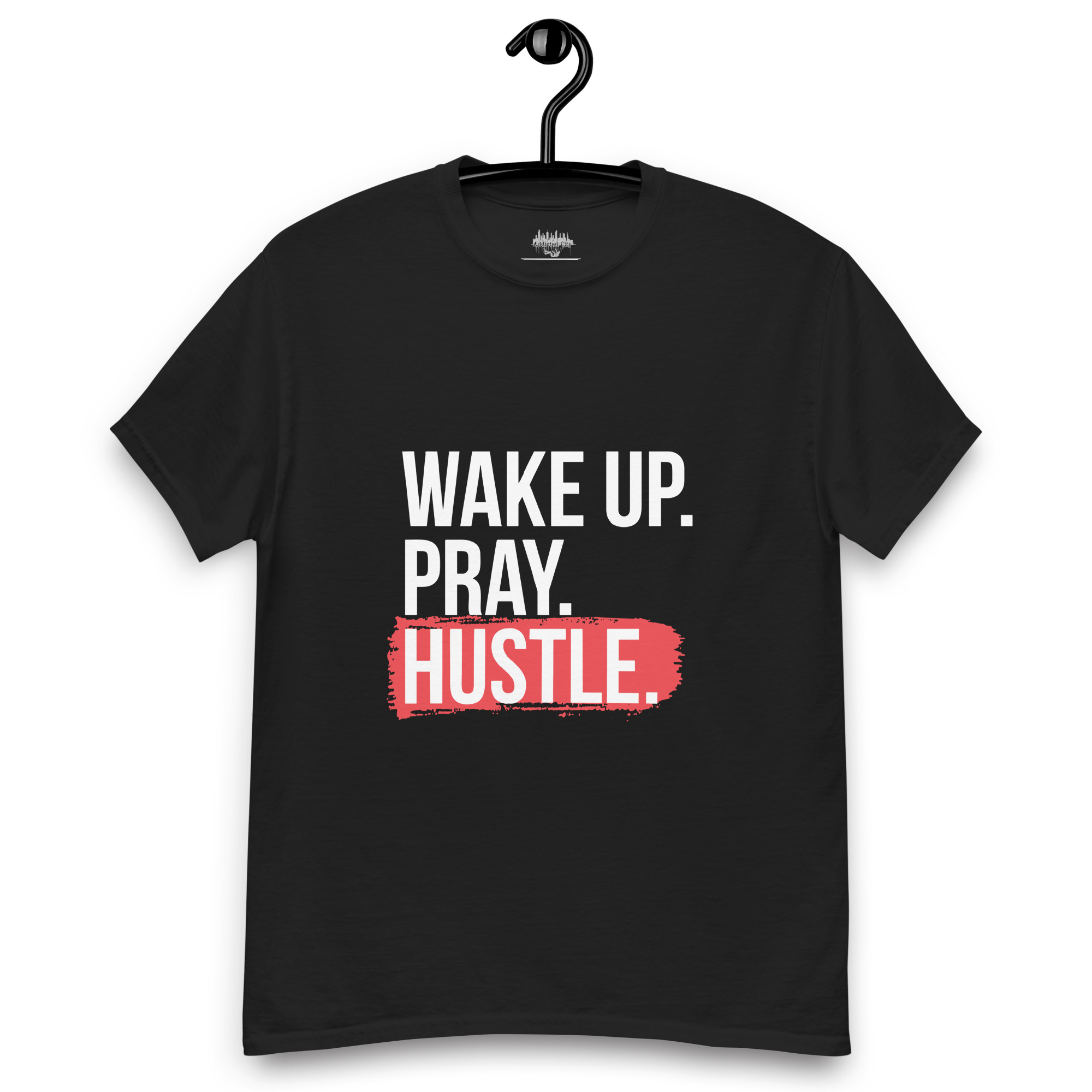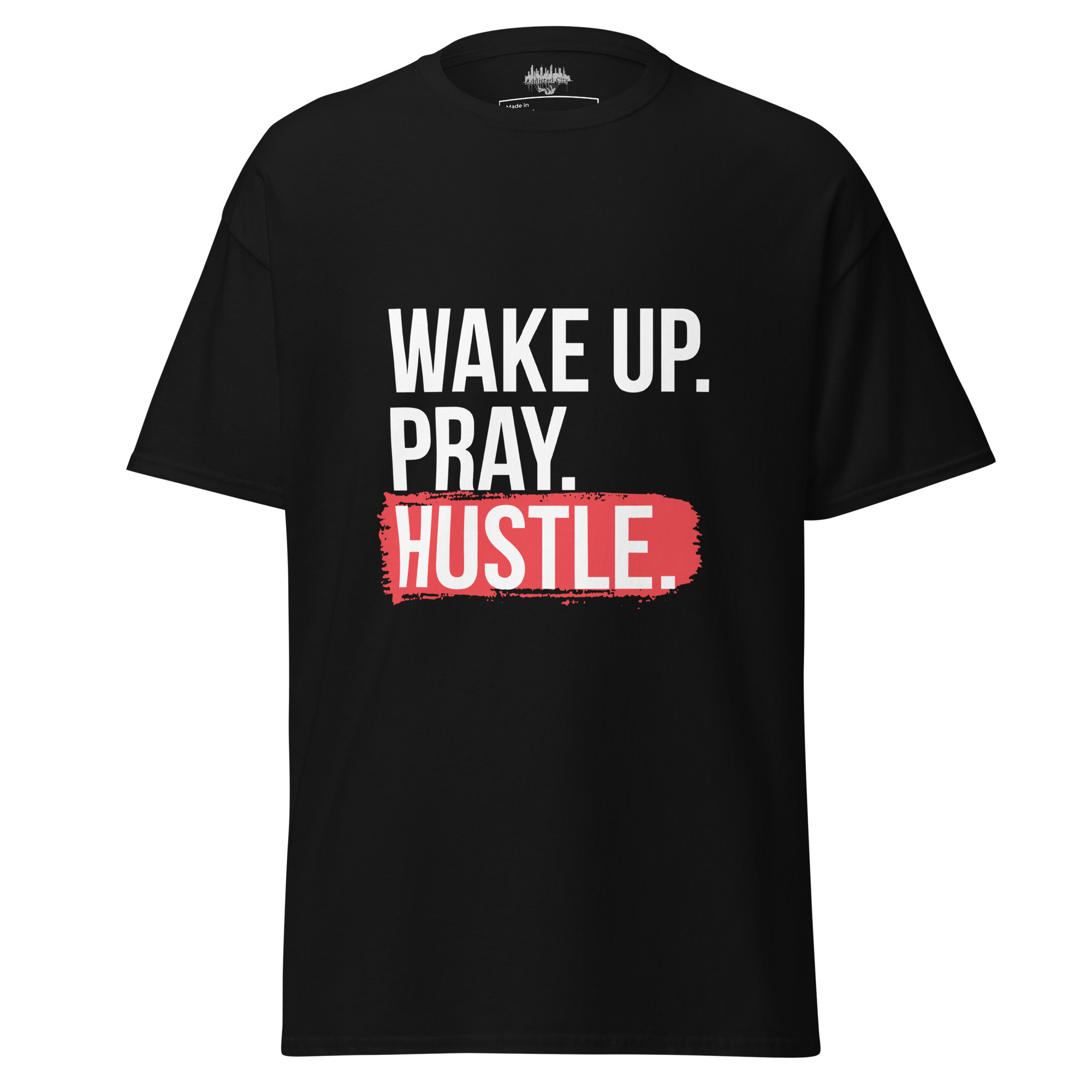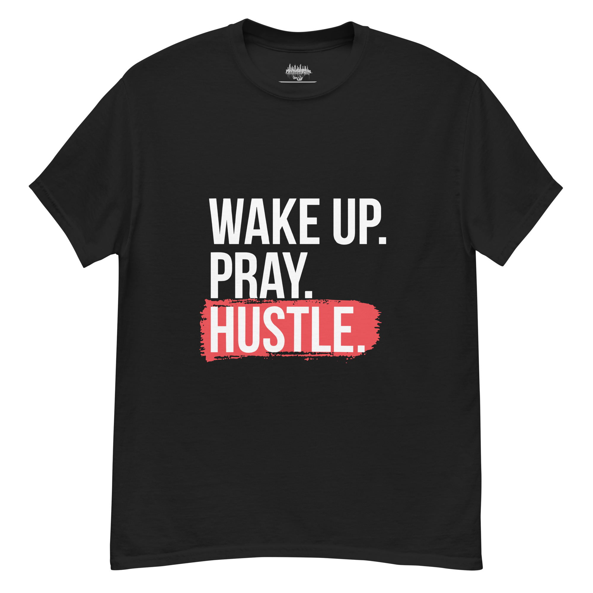 Keywords: Wake Up Pray Hustle T-shirt, Addicted City apparel, motivational graphic tee, hustle shirt, inspirational clothing, men’s streetwear, daily grind shirt, urban fashion.