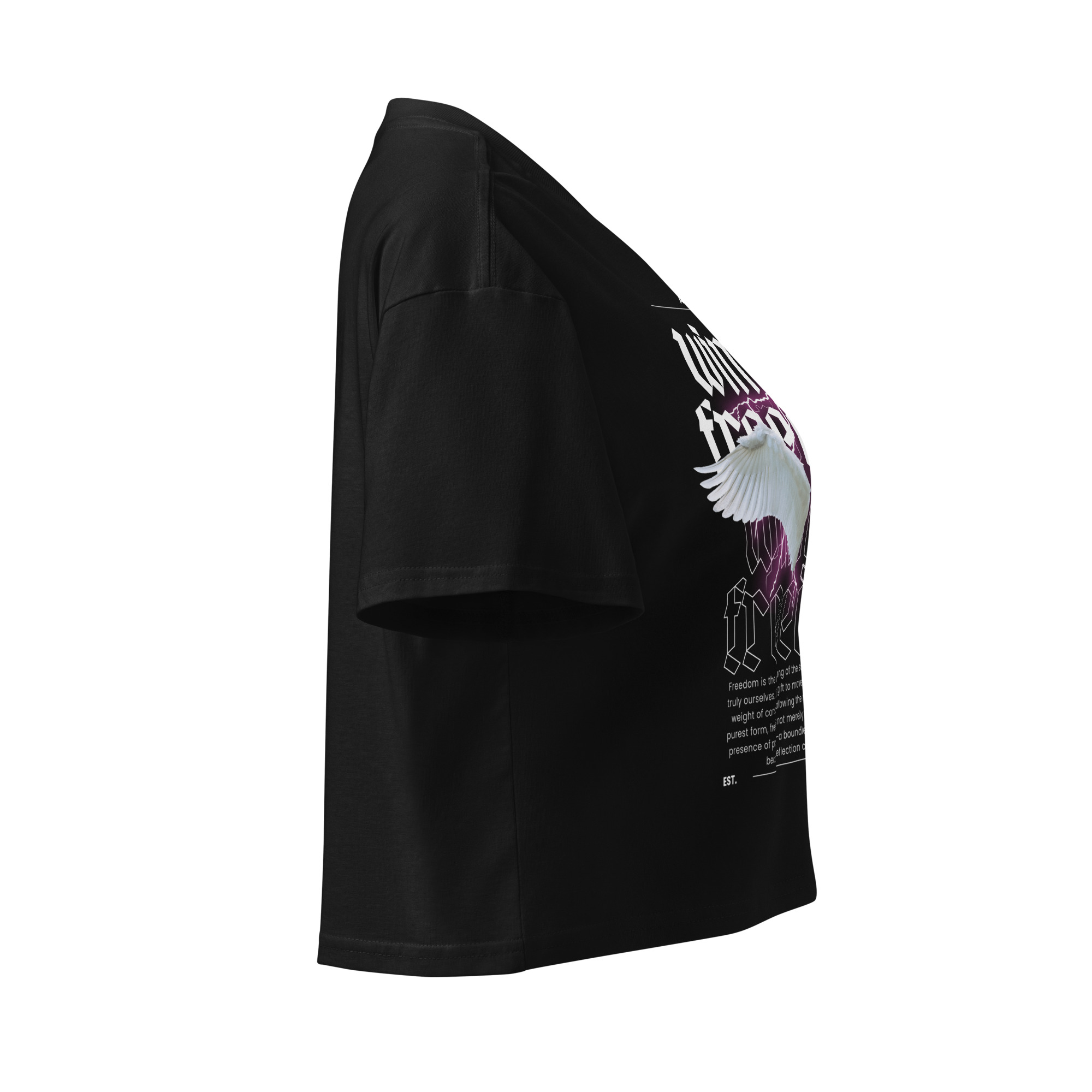 Keywords: Wings of Freedom crop top, dove flying graphic, freedom crop top, empowering graphic tee, peace crop top, inspirational graphic crop top, women’s crop top, spiritual crop top, trendy crop top, empowering fashion, bird graphic top, freedom style, chic crop top, peaceful graphic tee.