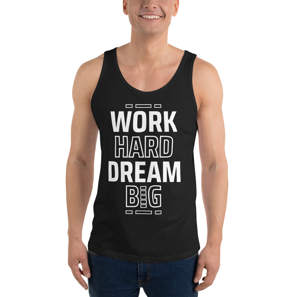 Keywords: Men’s black tank top, Work Hard Dream Big tank, Addicted City activewear, gym tank top, workout clothing.